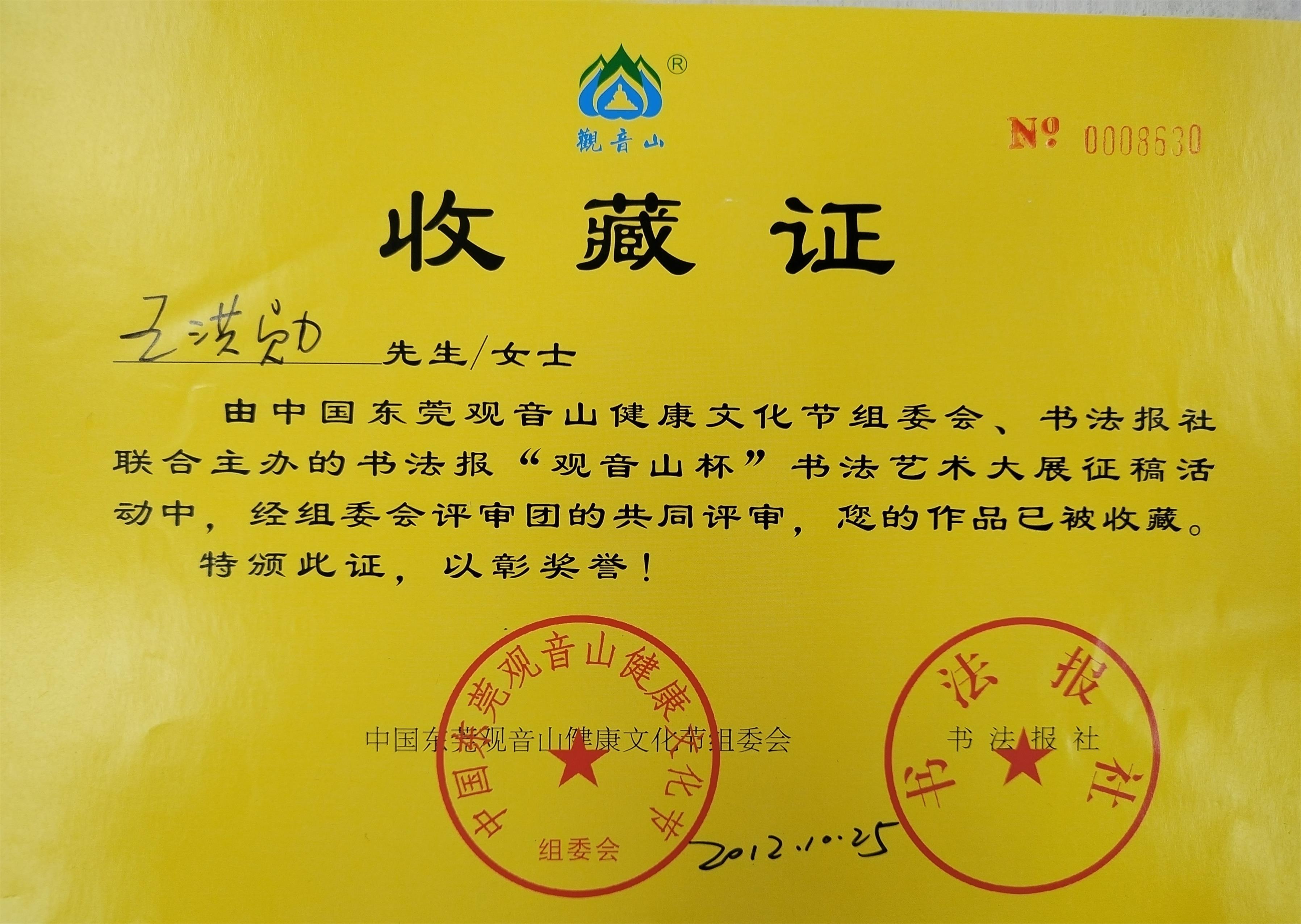 国书画大赛获奖作品选》、《中外书画艺术家辞典》。被评为一级书法师。