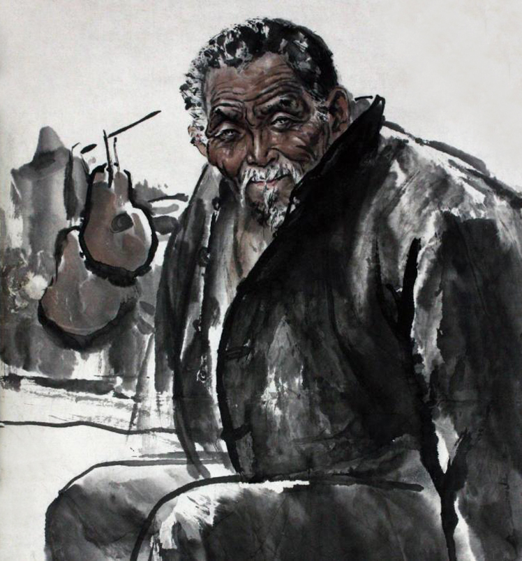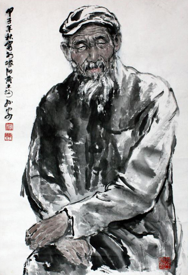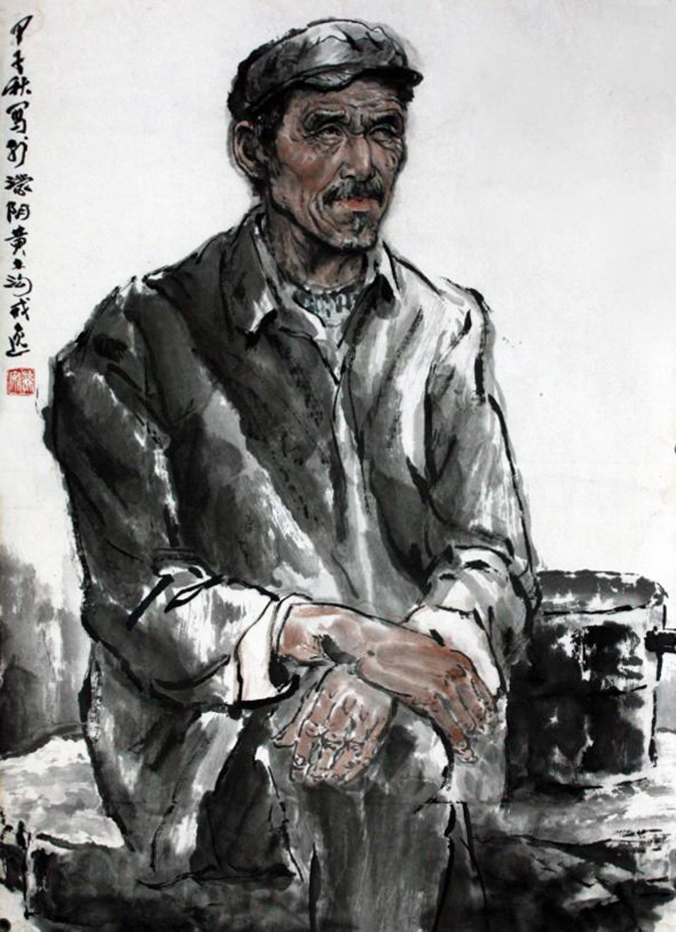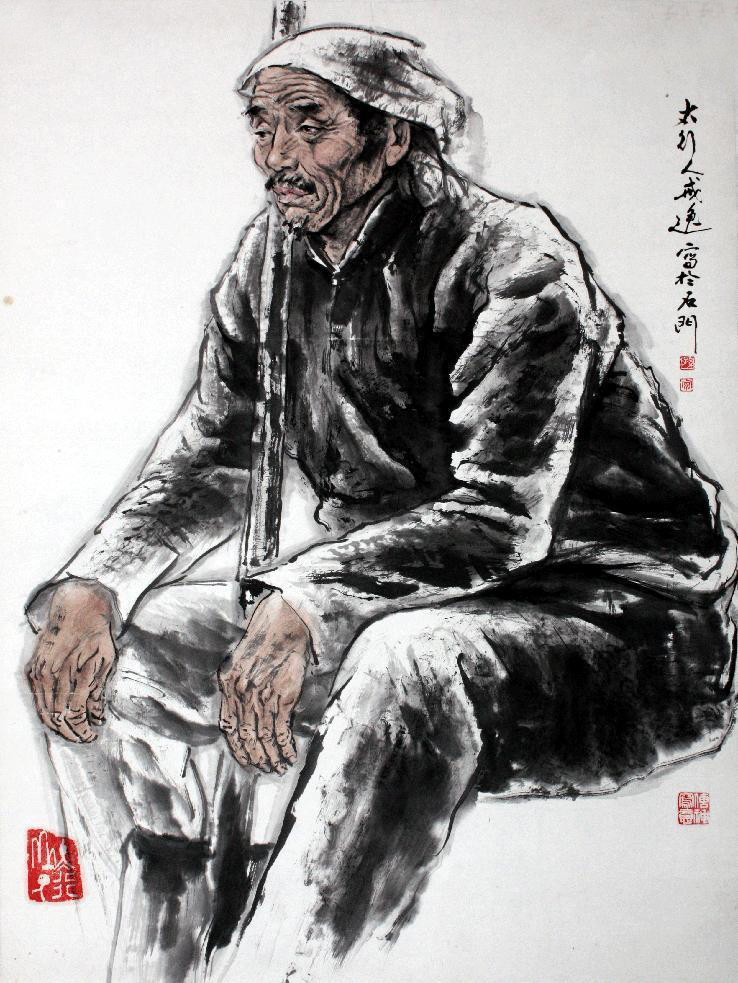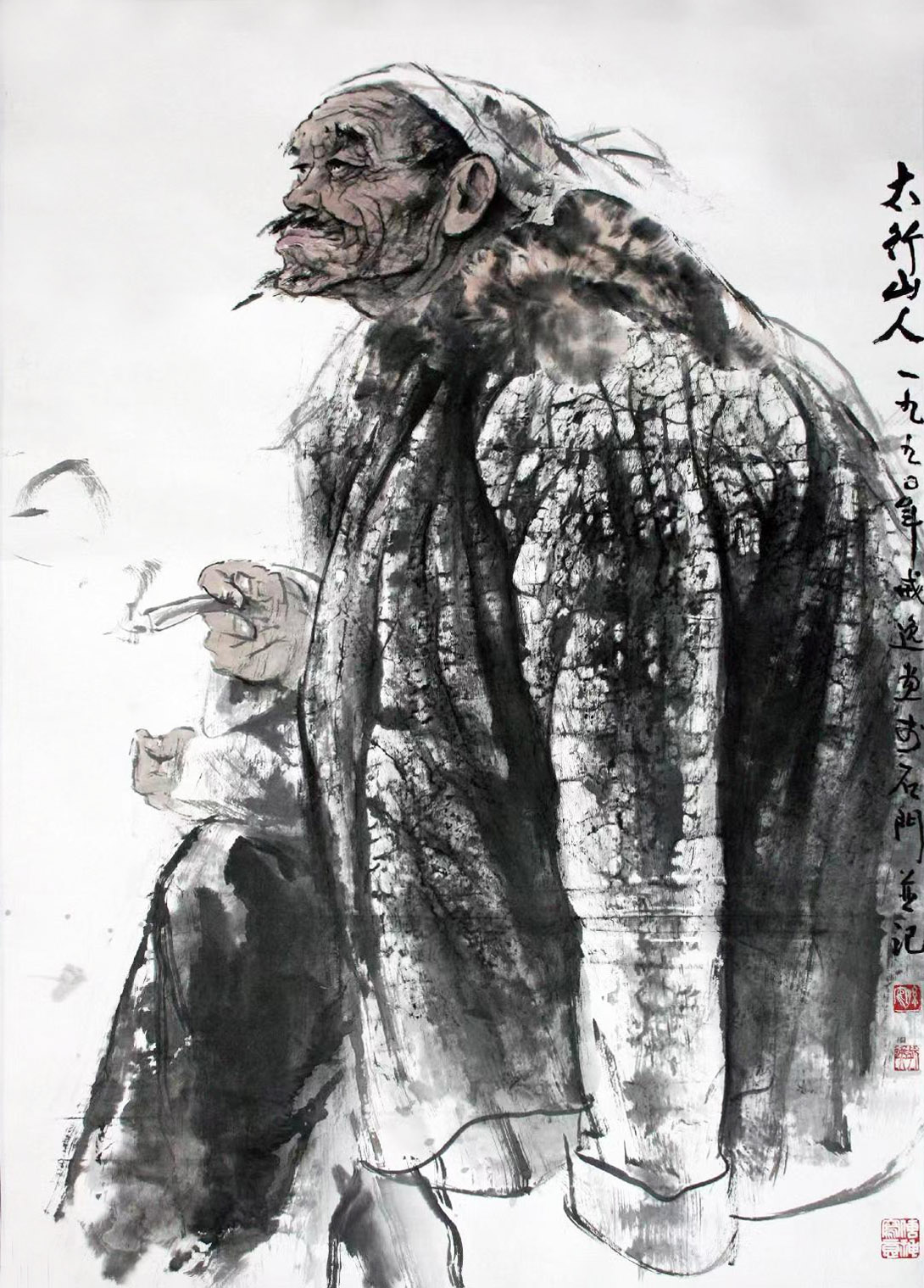 这幅作品虽然是面对真人写生,但他是在画家脑海里众多太行老农的形象中,提炼、取舍、综合,加工而成的艺术形象,是太行山的风骨,是民族的脊梁,是作者心目中的“意象”、“心像”。 看,老农那饱经风霜布满皱纹的脸庞和神态,都有力地揭示出 他那饱经风霜的艰苦岁月和历程。他经 历过抗日战争,解放战争及重建家园的磨难和洗礼,如今虽然生活富裕了,但他身披破旧的老棉袄,拿着自产自捲的旱烟大炮筒,可以看出他仍然保持着勤劳俭朴的生活习俗。其昂首远望壮心不已的精神状貌,犹如养育他的太行山,具有坚韧不拔的风骨,和刚毅顽强的生命活力。这种活力和风骨,正是支撑我中华民族从过去走向未来的伟大力量。 作品采取了仰视的构图,和山水画笔法的处理,使人物更犹如一座挺拔而高大的山峰。