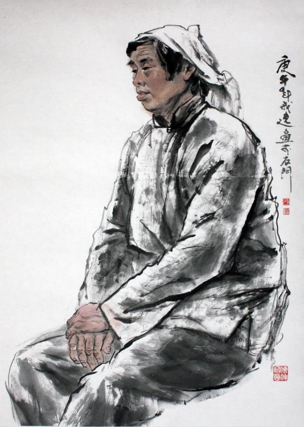 作品采取了粗犷、凝重、的用笔用线,并以山水画皴擦积染的笔法画衣纹,更增强了人物形象稳如磐石般的体量感。