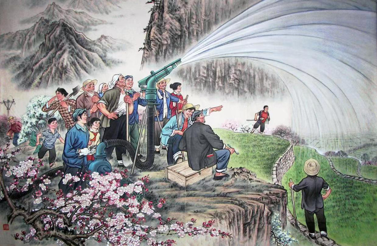 作品表现了太行山区的父老乡亲们为了科学种田增产增收,而群策群力研制出了一台引水上山的“人工降雨器”。当看到“人工降雨器”喷射出银白色的水柱,浇灌着梯田上下绿茵茵的幼苗时,随即从四面八方飞奔而来看热闹的男女老少, 前呼后拥地围拢在 “喷水管”的周围,有的在交头接耳地谈论着内心的感受和喜悦, 有的欢呼雀跃,在梯田上下奔走、欢呼、相告。大家看到了“人工降雨器”的成功与威力,更增强了对科学种田、再无旱年、人定胜天的希望和信心。远景,淡墨皴染,群山重迭,云雾缭绕。近景,鲜花盛开,千姿百态,春光明媚,使作品呈现出一派欢欣鼓舞,和欣欣向荣的欢腾景像。作品不仅表现了太行山区农民追求科学种田创高产的愿望和渴求,展现了其战天斗地,人定胜天,多打粮食的信心和力量。同时也记录了太行山区农业发展变化的历史进程。