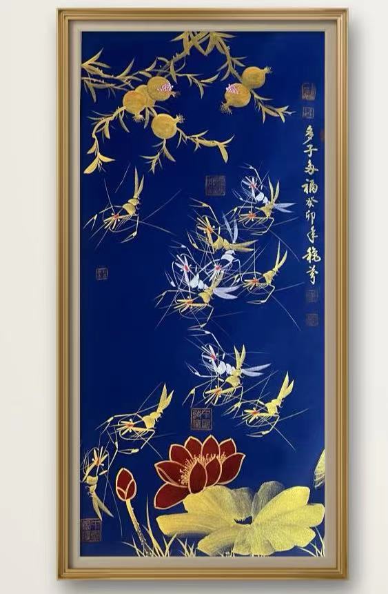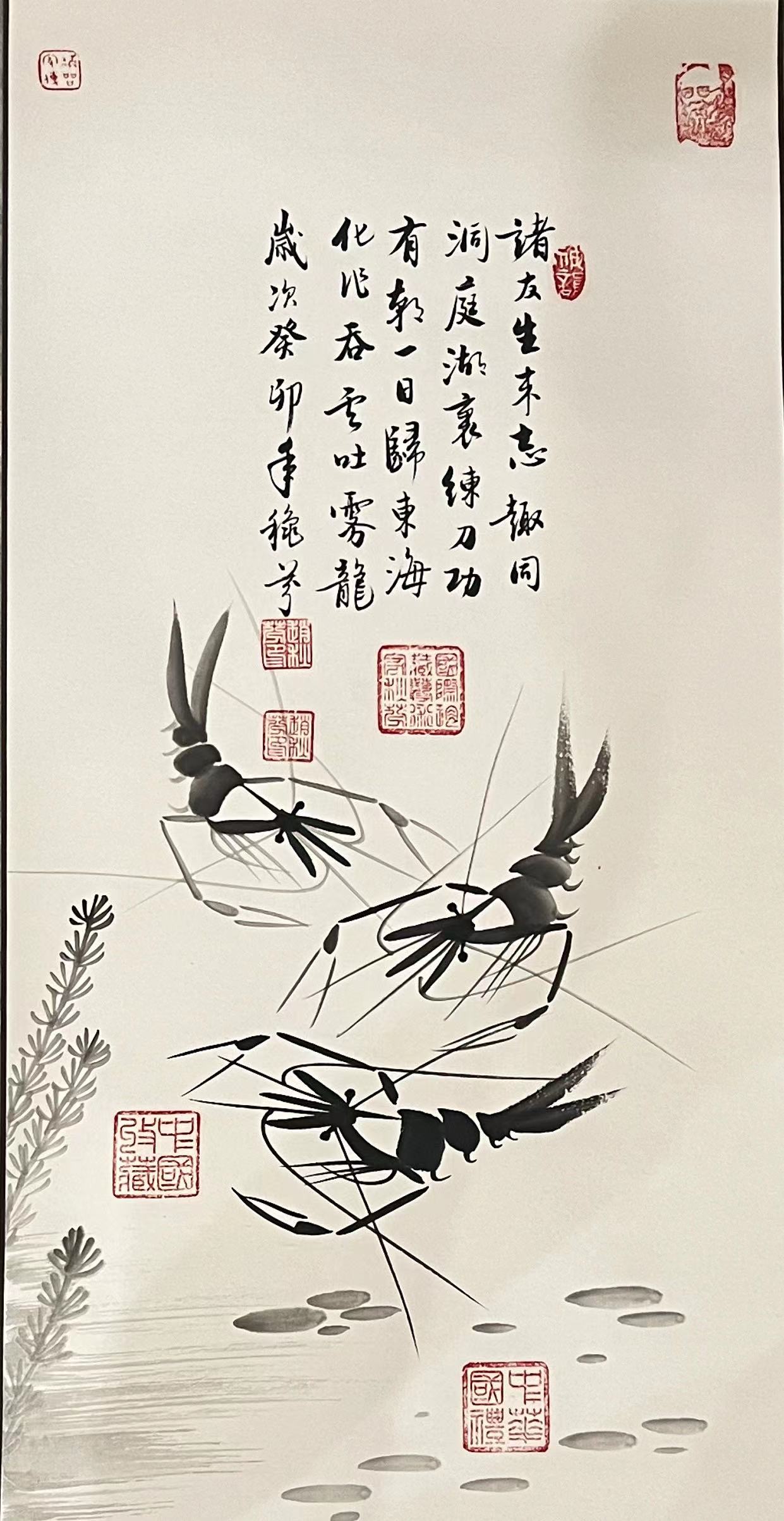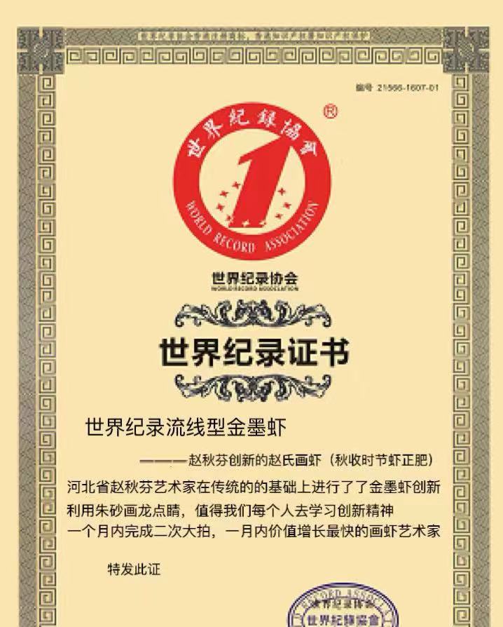 金墨虾第一位挑战吉尼斯世界纪录作品,2018年3月上拍608万,2018年4月上拍1700万元,被授予国际收藏艺术家称号及印章,市面上仅存200张