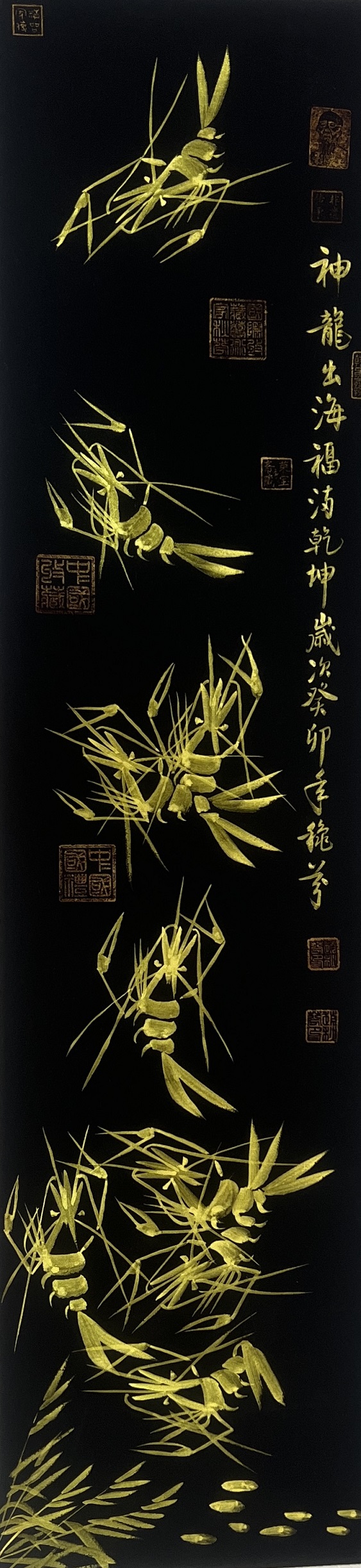 鸿运当头:2006年央视十二频道《艺术传承》展播;在亚洲博鳌大会首秀作品,存于博鳌文化馆,黑色长卷开创者,荣获“世界画虾第一人”称号