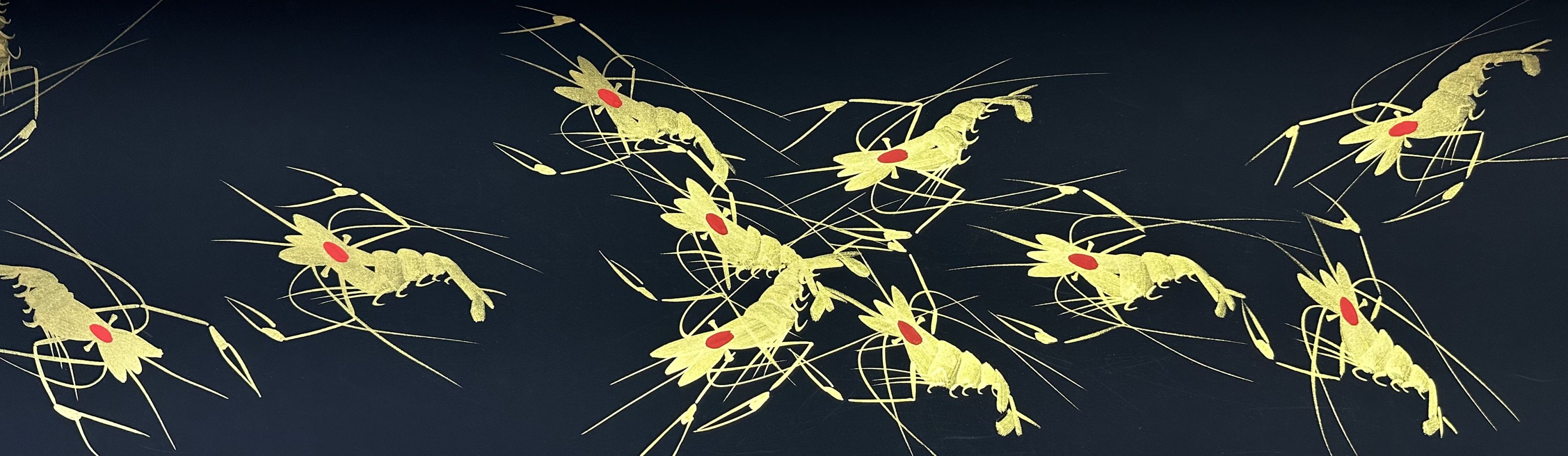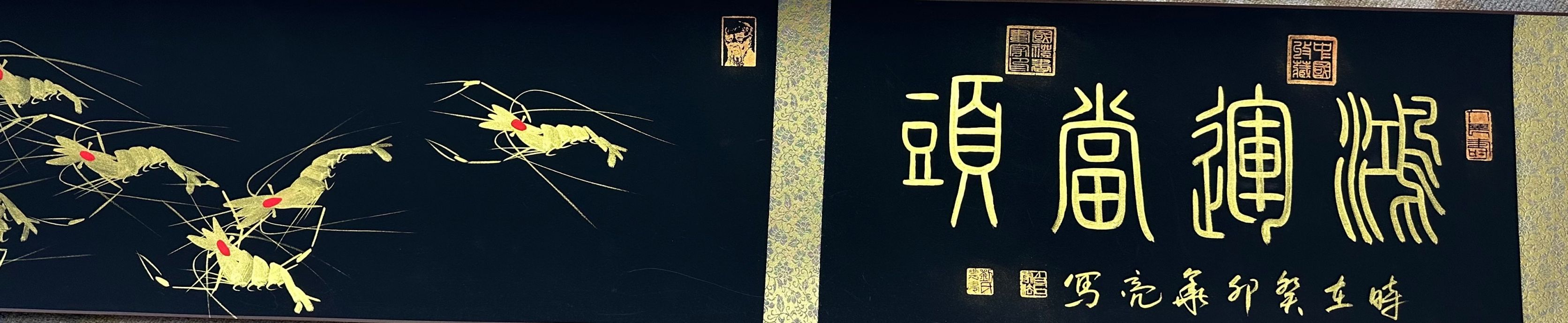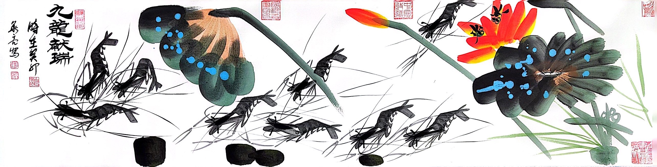 五米长卷《金虾纳福》:两岸艺术交流会入展作品;发行世界邮票1000万张,获最具影响力墨宝,打破长卷拍卖纪录。