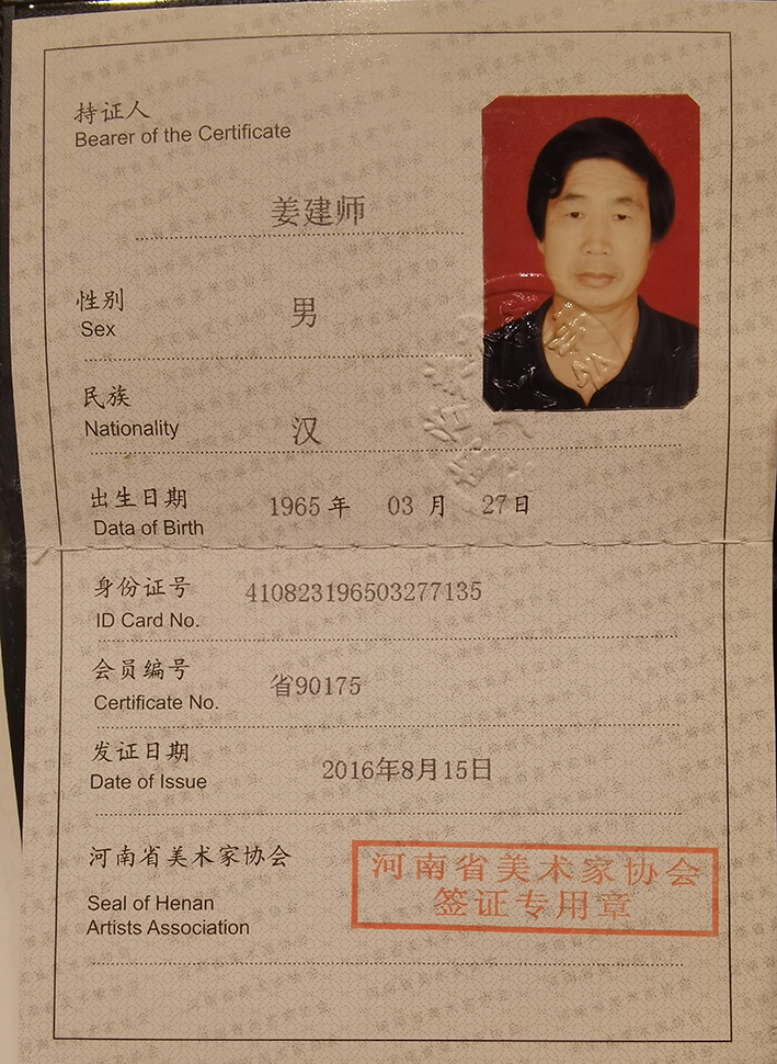 姜建师--号醉墨轩主人,1965年生于河南焦作,毕业于河南大学美术系。师从中国当代著名超大写意画创始人一上官英超老师,宋晓东(先为郑州轻工业学院工艺美术硕士研究导师)(河南文史馆馆员)深受两位老师的影响,形成稳重大气、彩墨淋漓的画风。后专攻中国花鸟画,特别是对农作物情有独钟。现为河南省美术家协会会员、中国工笔重彩书画家协会会员、河南省将军书画院常务理事。