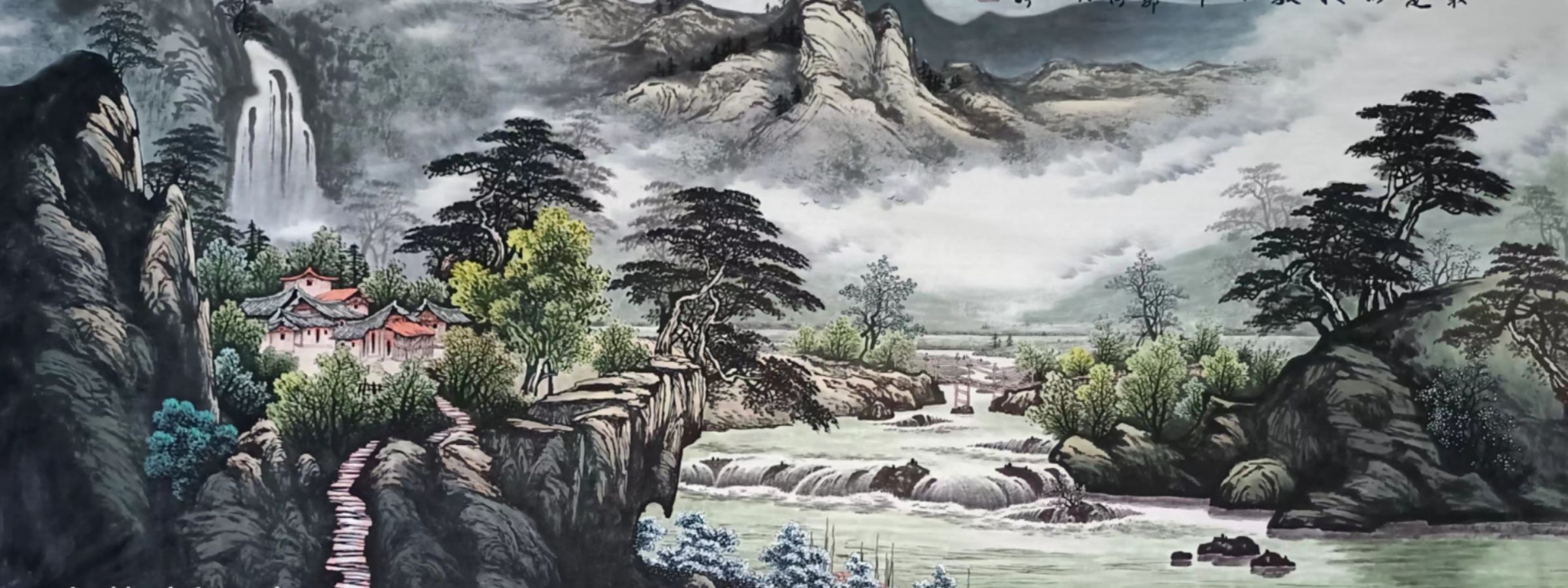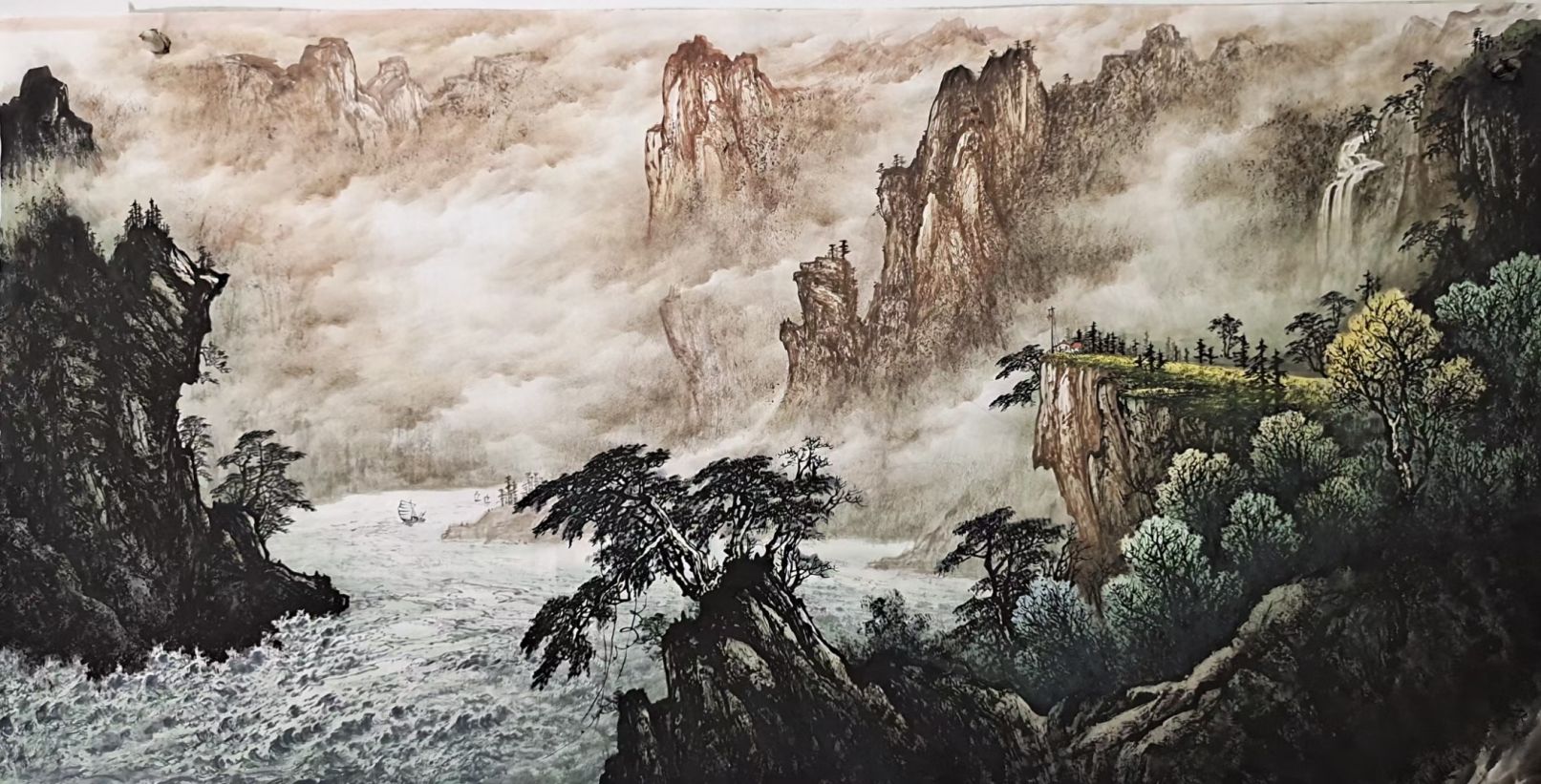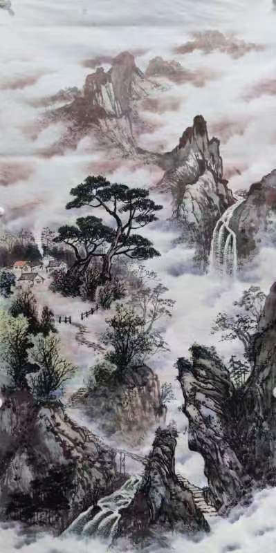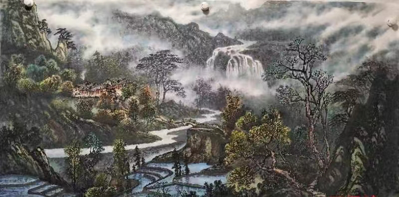 薛敬针作品构图唯美,风格厚重,你可以感受一幅作品的气息,甚至是声音。连绵的重山,环绕的溪水。充满张力和淋漓的元气,体现动感和鲜明的力度。具有较高的写实能力和笔墨功夫,构图壮阔气势雄伟,重山复岭,错落有序,树木葱郁,溪水潺潺,笔墨酐畅,不仅有气势而且有声势,保持了笔墨自身独特的审美魅力,又十分耐人品味,能体会到他作品里洋溢出来的恢宏大气,具有时代特征的艺术风格