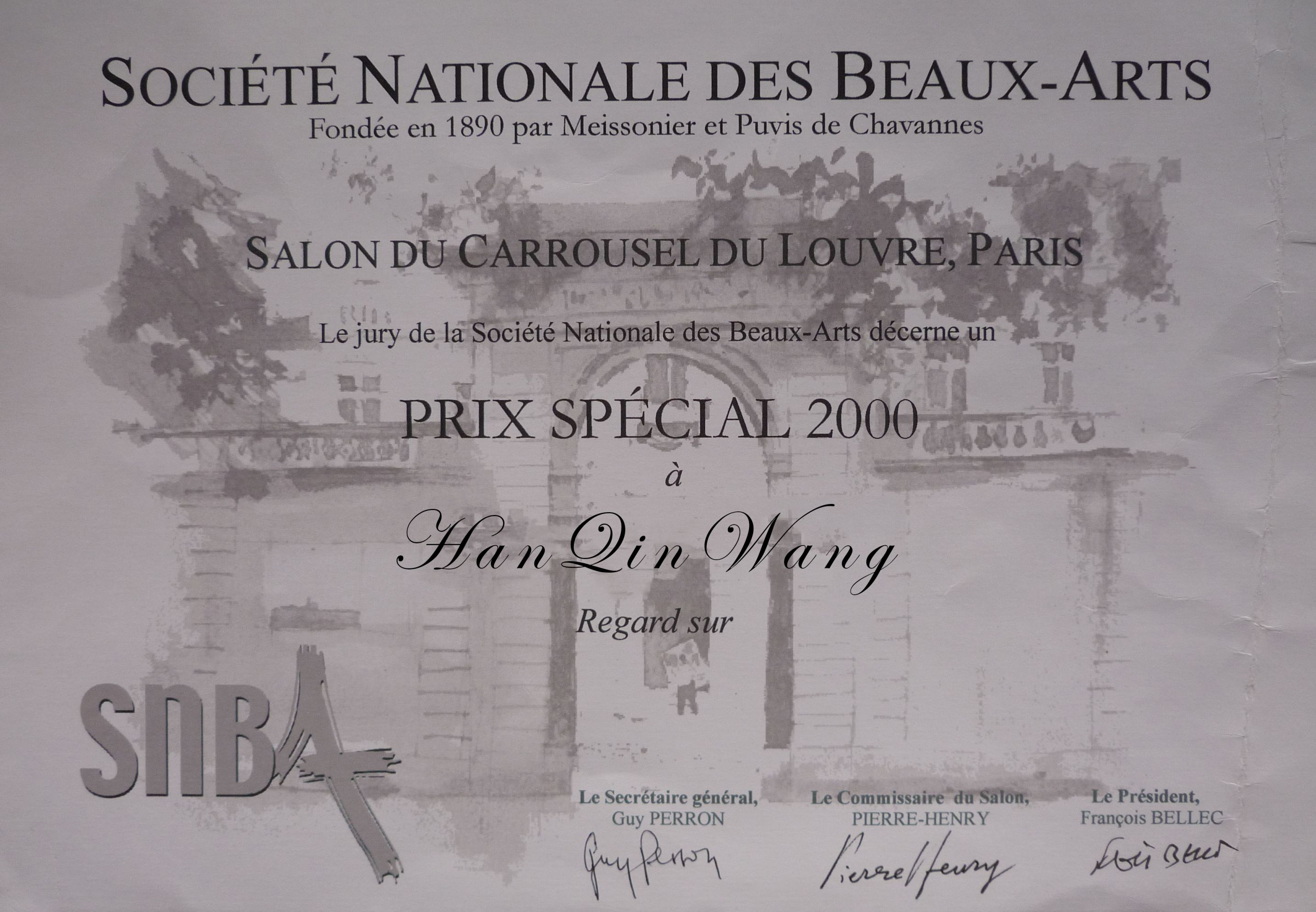 证书翻译为:法国国际艺术协会评审团在2000年法国巴黎卢浮宫国际沙龙展上授予王汉琴先生特别大奖。
