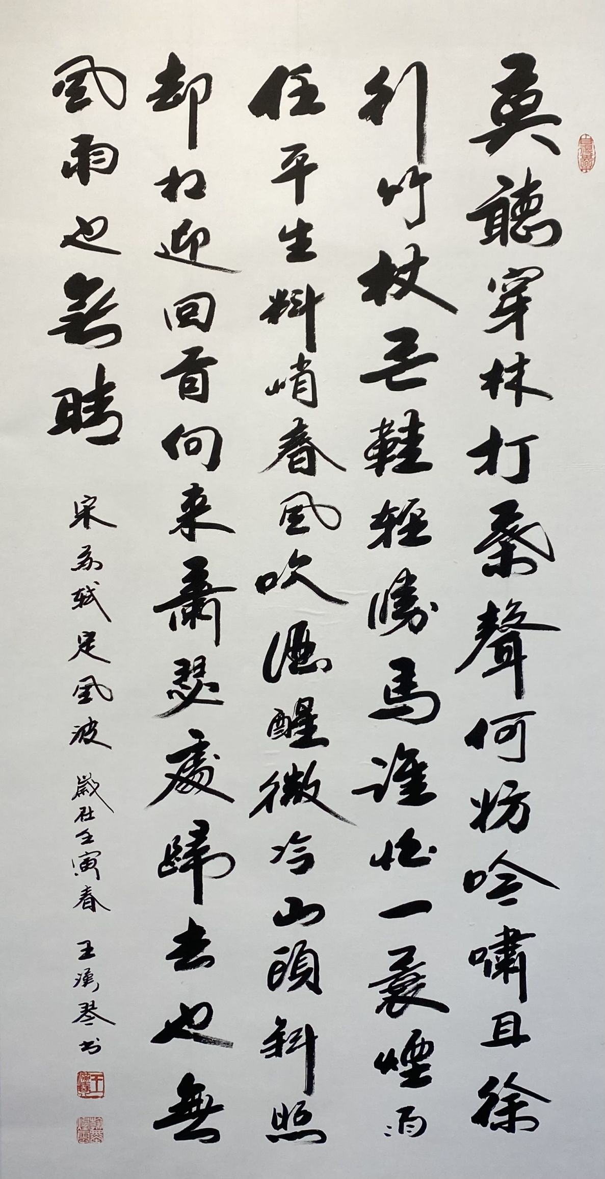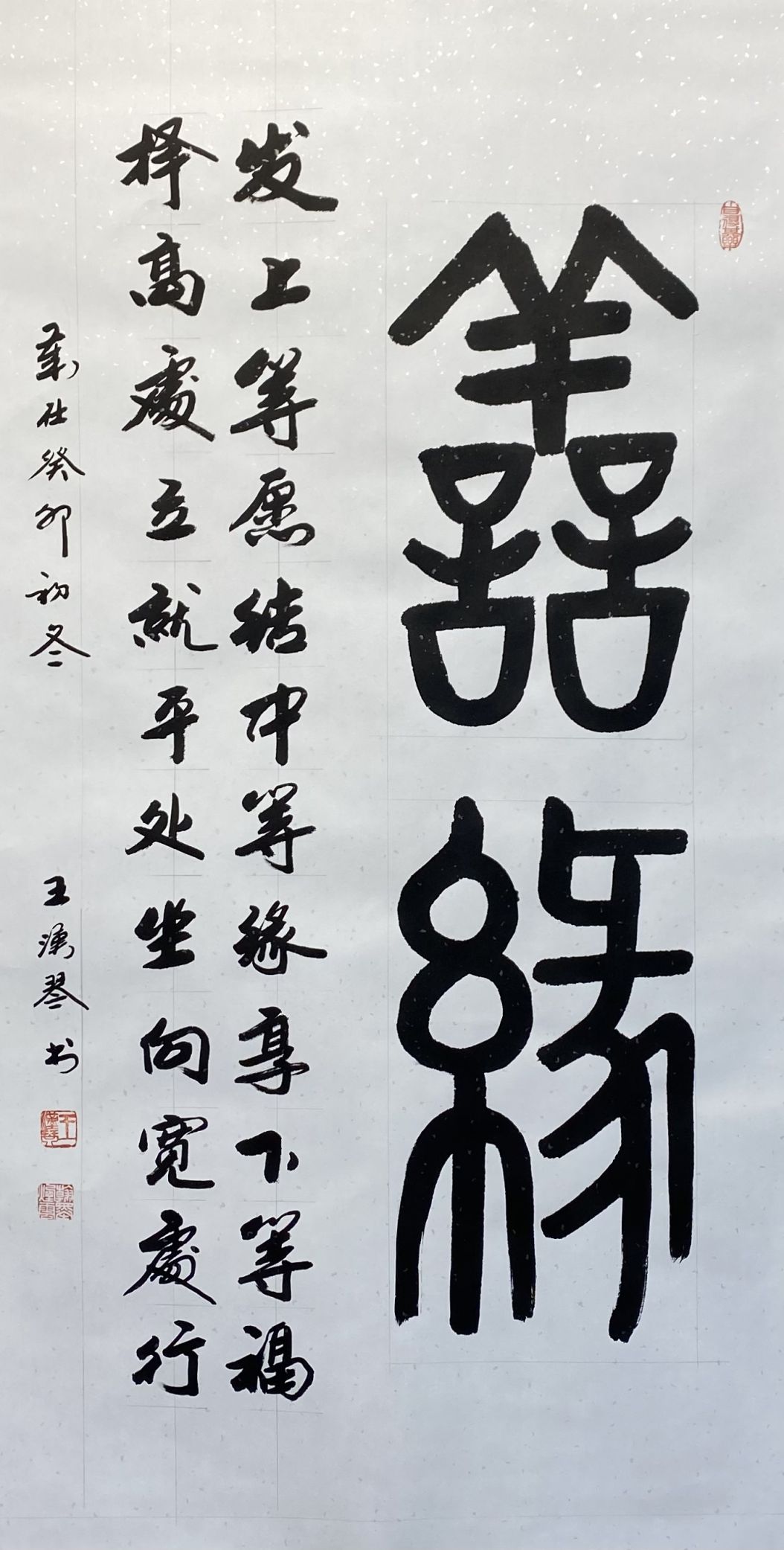 王汉琴先生的行书作品中,单个字的力度不只是指通过点画形态外扬出来的,同时还要求这种外扬的力度与力透纸背的点画所内含的力以及形态结构上内敛的力相契合,使之有一种骨力洞达、神完气足的力度美。