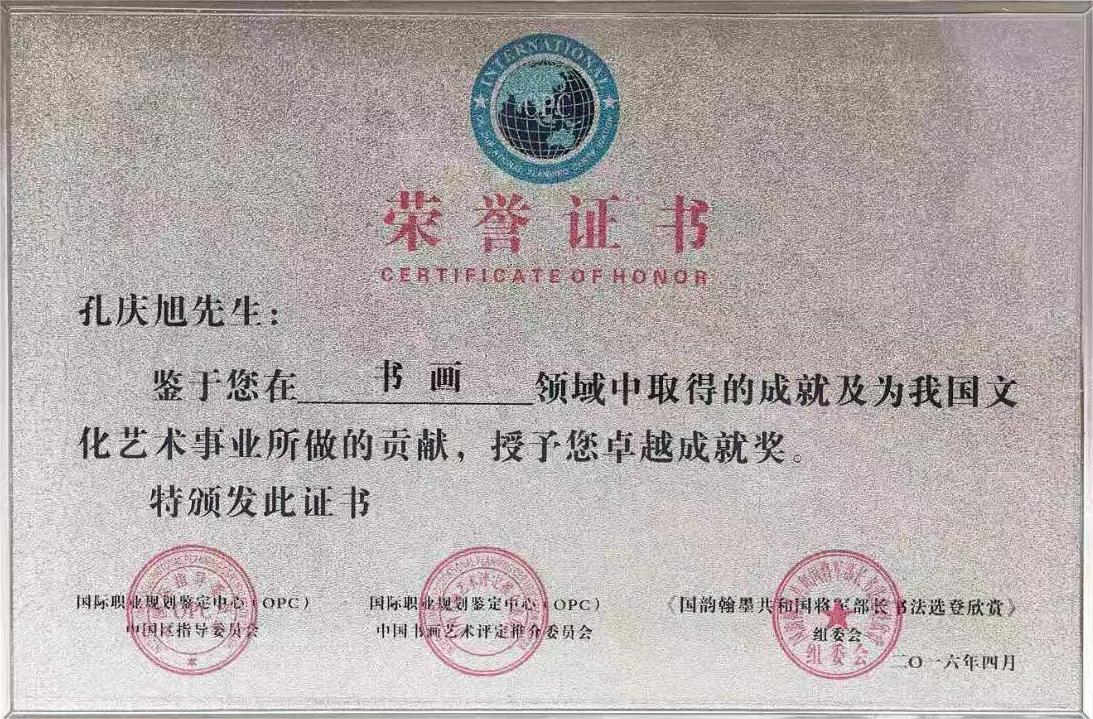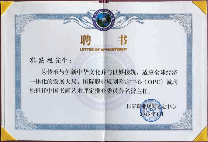 2015年被国际职业规划鉴定中心聘为中国书画艺术评定推介委员会名誉主任。同年作品被编入文化部文化艺术人才中心出版的《共筑中国梦—当代文化艺术人物风采集》,同年作品荣获“儒风墨韵润华夏”中国孔子书画艺术展书法类特邀金奖。