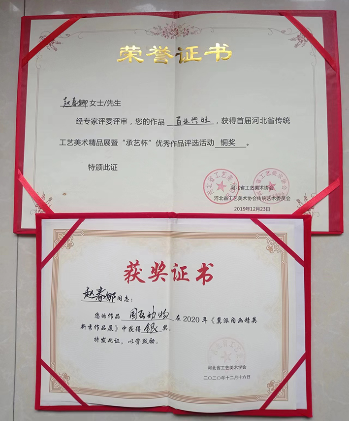 擅长各种内画动物画,2020年5月参加工信部“万众艺心、抗击疫情”主题的工美作品征集活动并获得荣誉。后参加了2019年由衡水市文联和冀派内画协会举办的“内画技艺河北省工美协会和传统艺术委员会举办的河北省传统工艺美术精品展暨“承艺杯”优秀作品评选活动中获铜奖。 后在2020年河北省工艺美术学会举办的《冀派内画精英新秀作品展》中获得银奖。并参加“内画传承与创新人才培养”培训班。