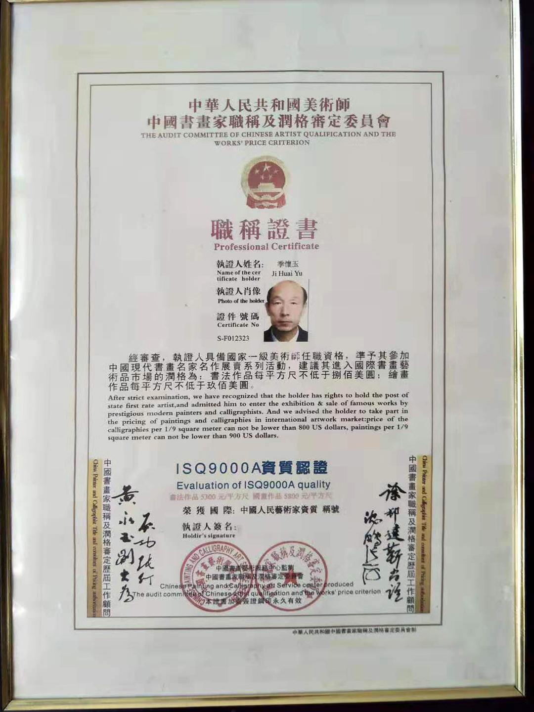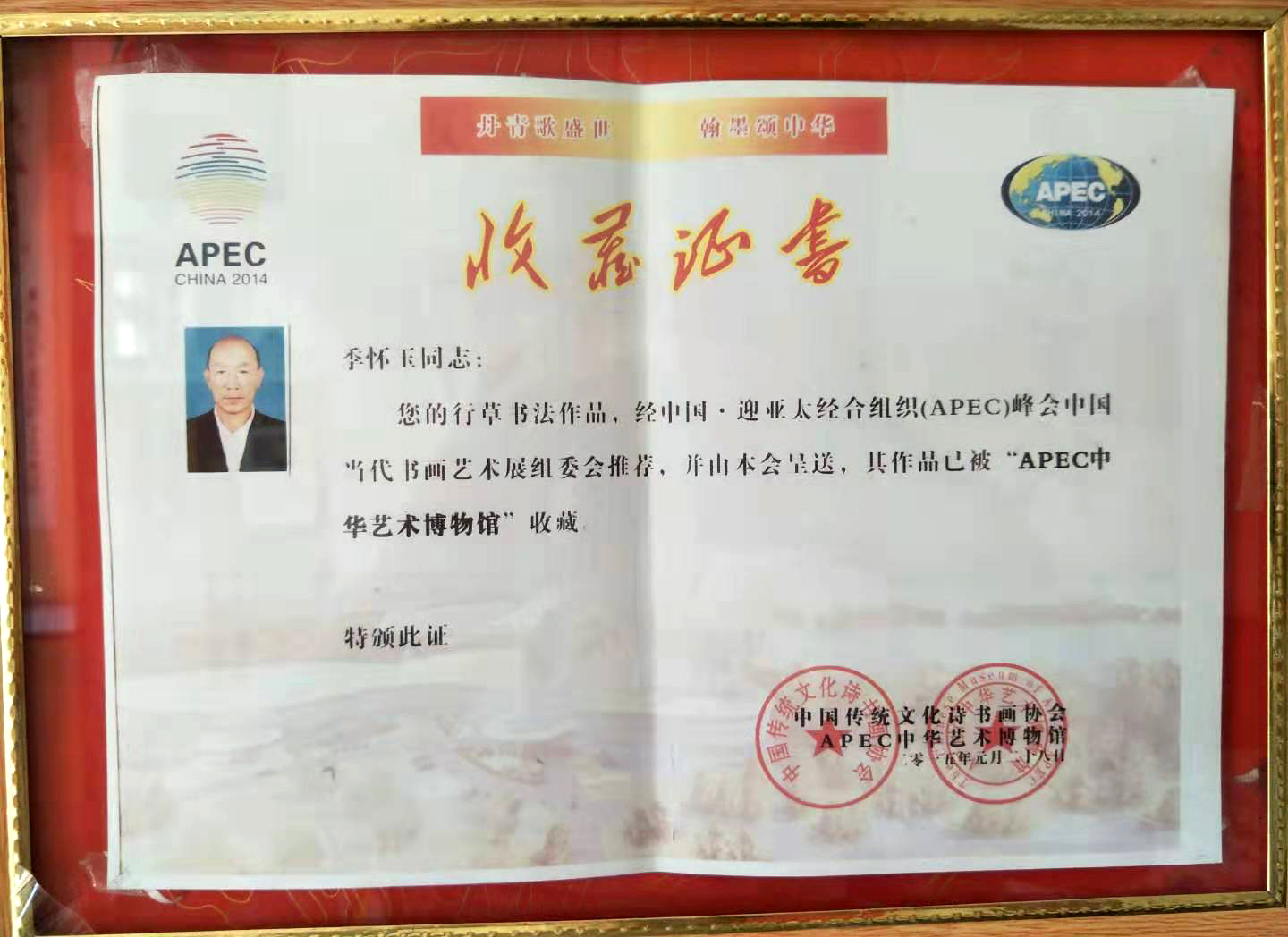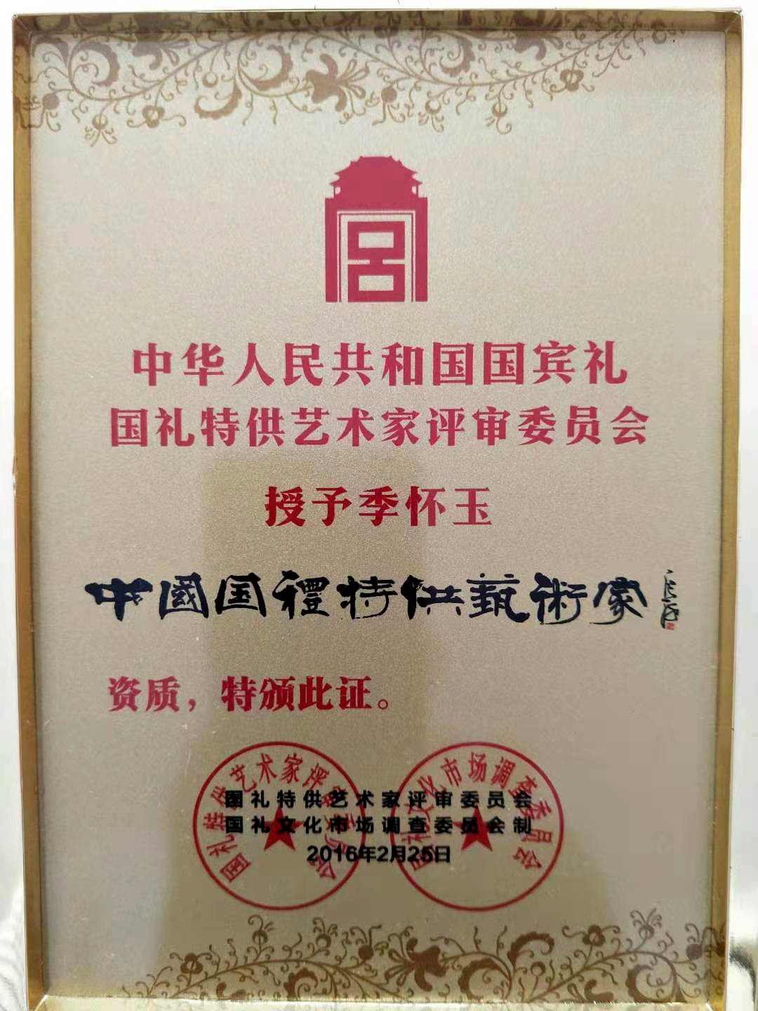 季怀玉,男,河北,国家一级美术师,中国国礼特供艺术家,中国毛体书法家协会会员,亚太地区特殊贡献人物,祖国特殊贡献人物,中央电视台华人会客厅特邀专访人物,入编中国现代书画篆刻界名人录,作品曾被奥运会征集出版,全国书画大展赛中荣获金奖多次,2014北京ABEC峰会最具影响力的书法名家,作品在全国政协礼堂展出,尔后在香港,首尔,新加坡,印尼,澳大利亚巡展,被中华艺术博物馆永久收藏,载入史册,并颁发收藏证书,特邀国际国内邮票出版三次等。