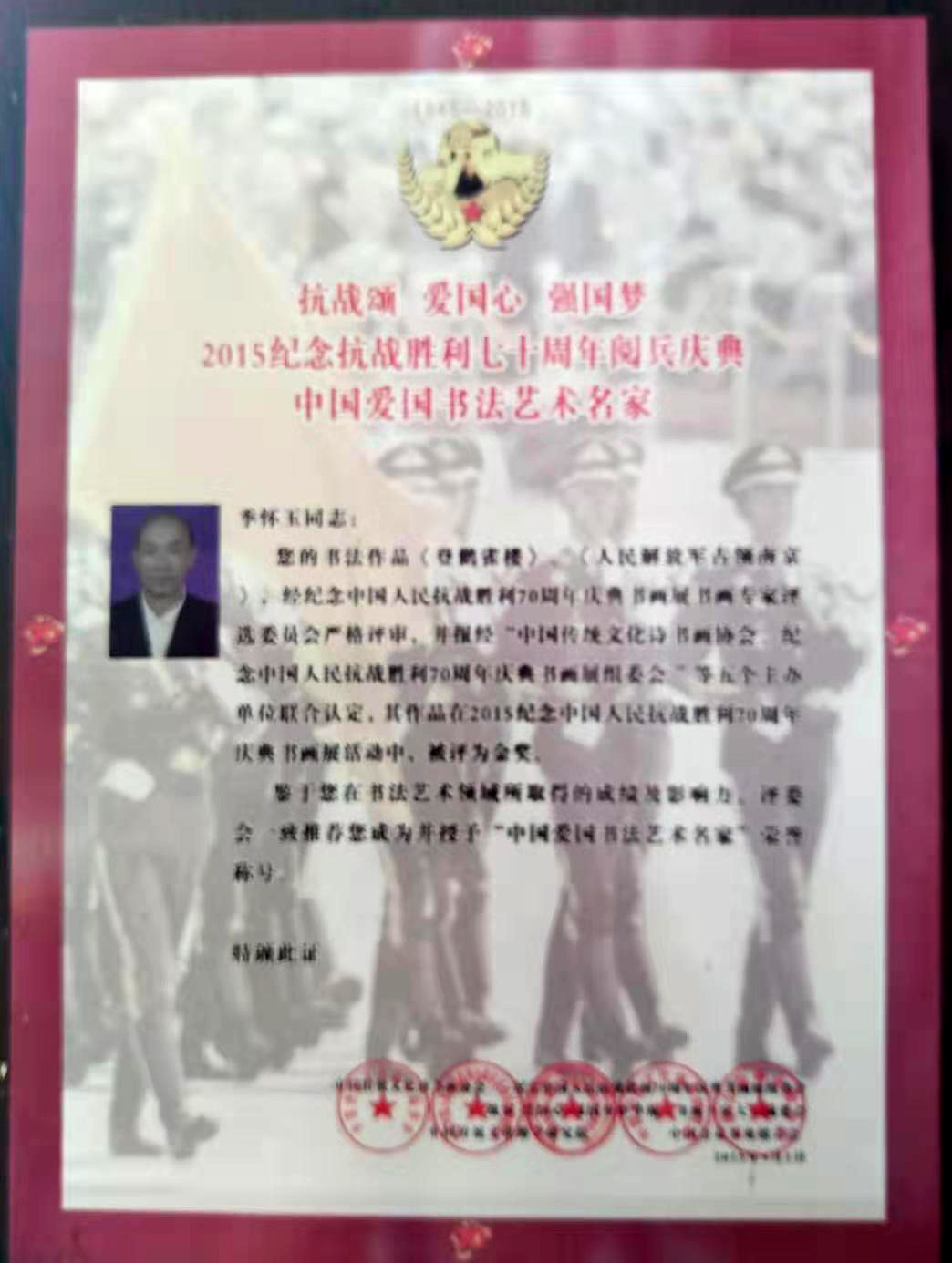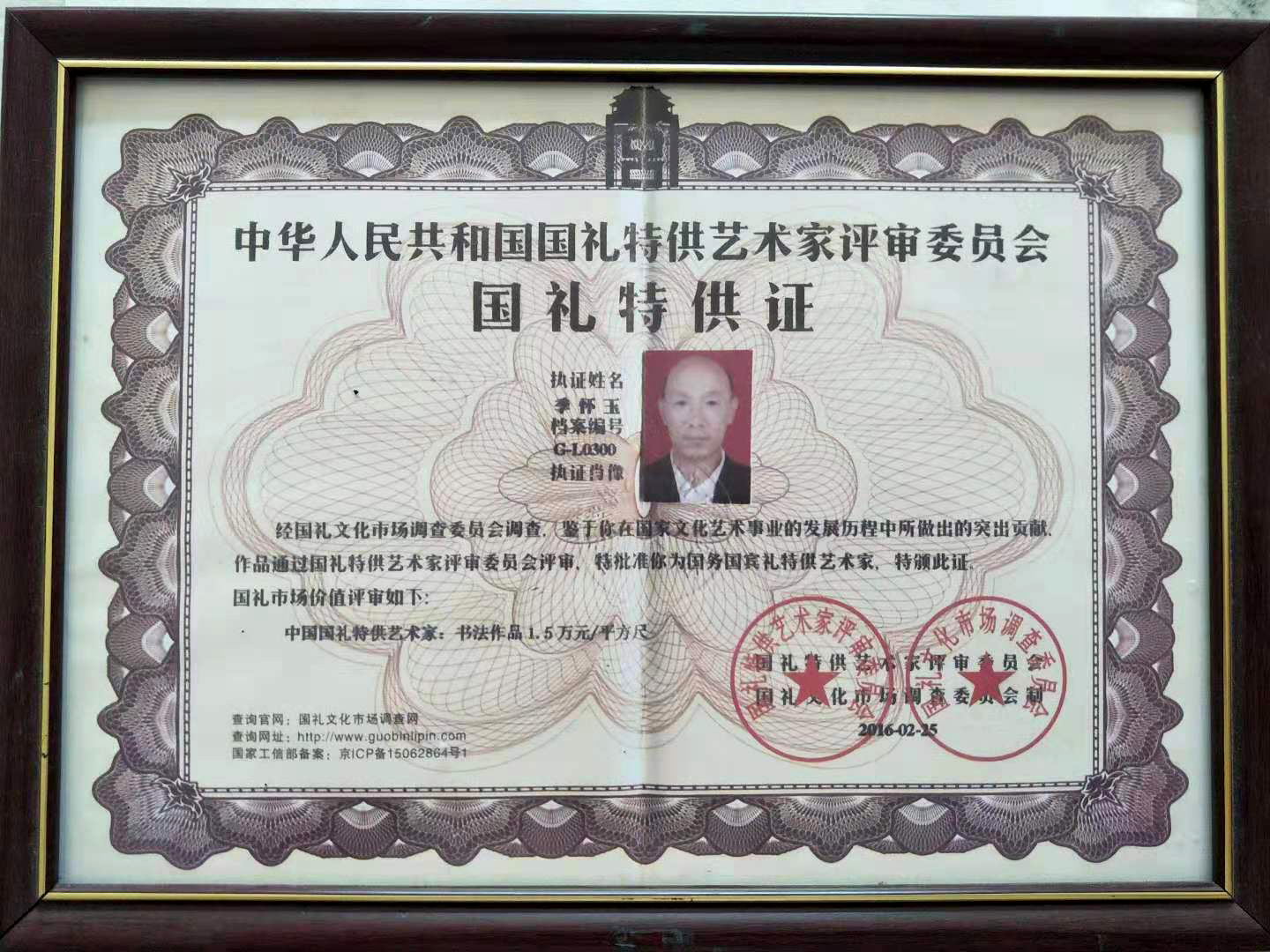 国家一级美术师,中国国礼特供艺术家,中国毛体书法家协会会员,亚太地区特殊贡献人物,祖国特殊贡献人物,中央电视台华人会客厅特邀专访人物