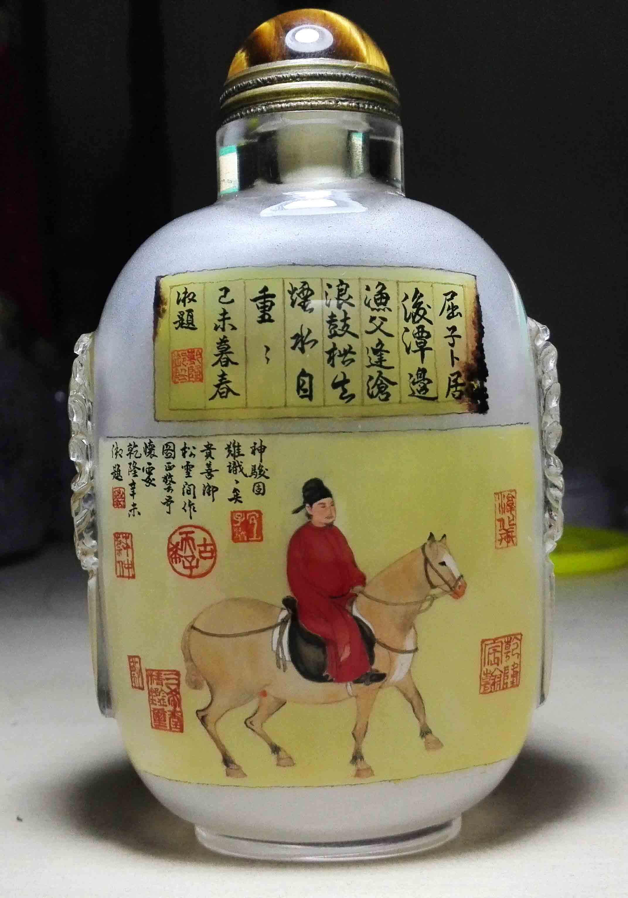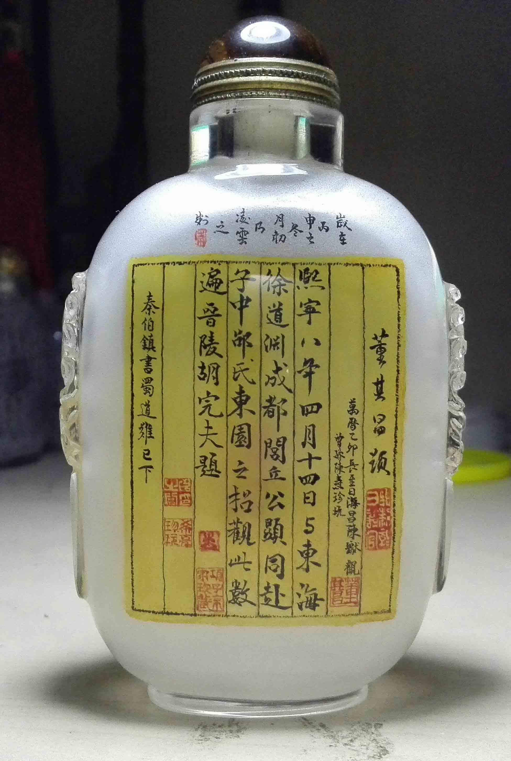 李占营:艺名凌雲。斋号润物轩。1977年生于河北省衡水市。爱好广泛,自幼酷爱书法绘画艺术,尤以动物、山水、书法、篆刻见长,又以琴棋笛萧辅之修心养性。中国内画研究院理事、河北省内画鼻烟壶协会会员、河北省内画收藏家协会会员、衡水市内画艺术家协会会员。是中国国家工艺美术大师付国顺先生的弟子,冀派内画泰斗王习三大师的徒孙,冀派内画第三代传人。除绘画书法之外,在内画工具笔的制作上,也打破了传统的做法,做工精细,用料考究精美,尤其是大号圆瓶写字用笔的制作,构思巧妙,填补了普通内画笔无法书写的空白。在大水晶球侧面内壁的书写方面,也改变了普通写法写不好字的以往格局,用超高难度的倒拿笔的方式书写,又创新技。