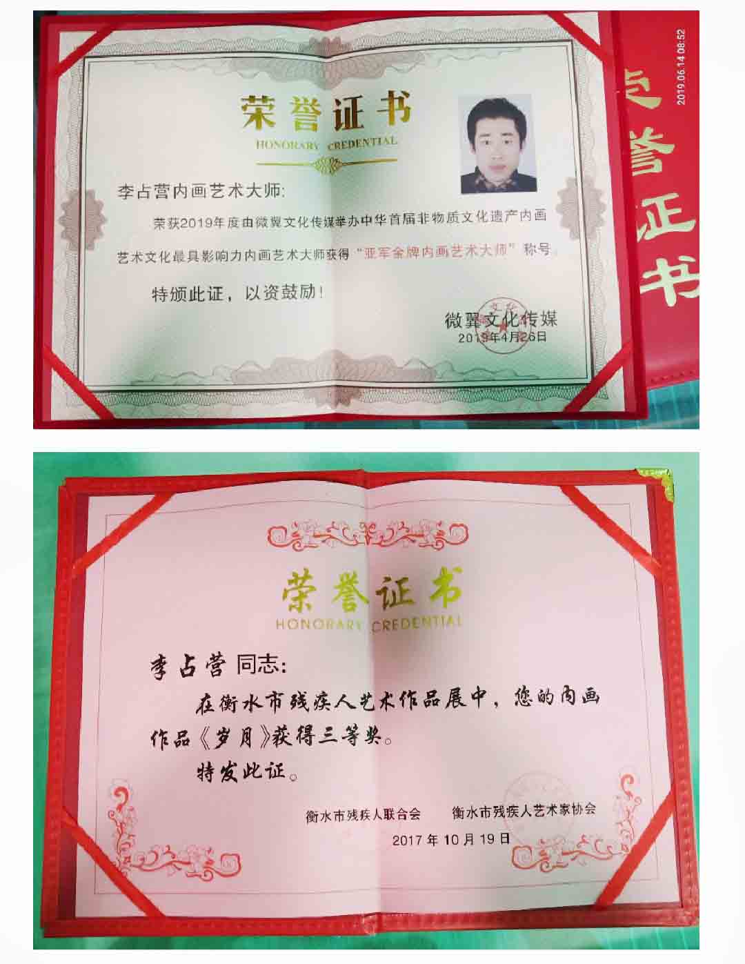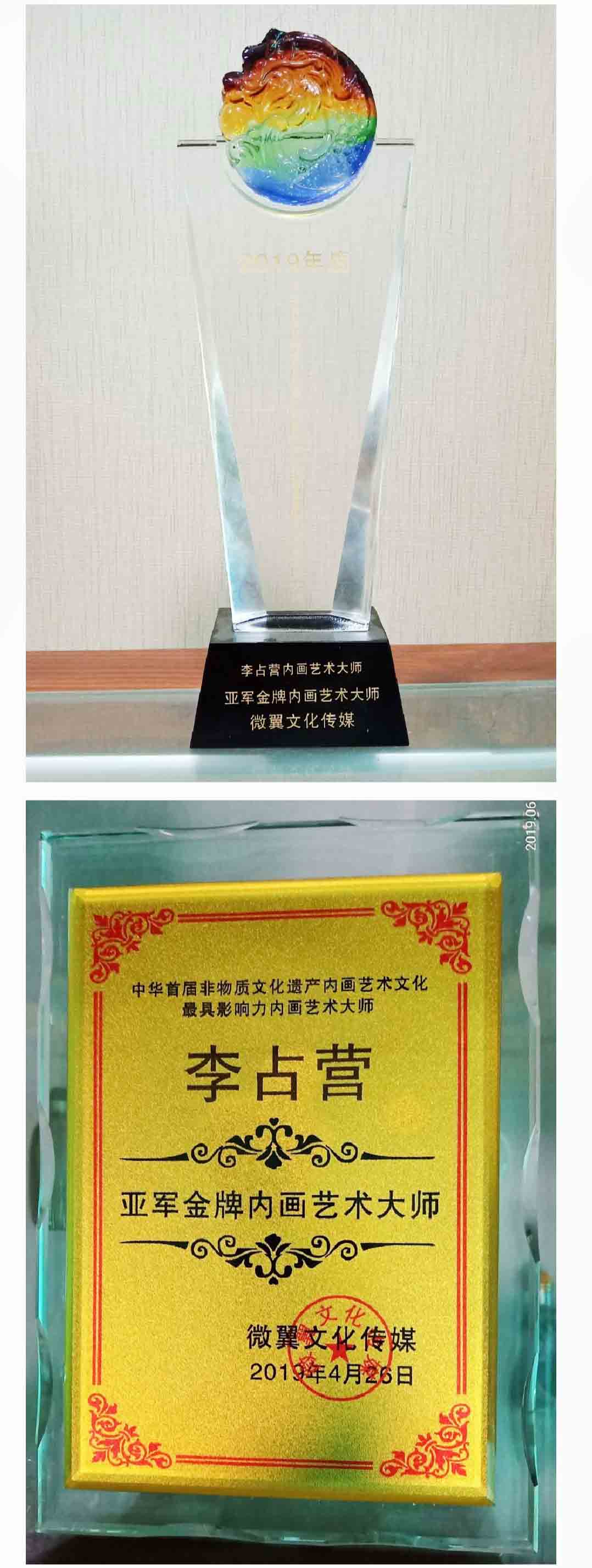 2019年,作品《仿毛主席书法》在中华首届非物质文化遗产内画艺术最具影响力内画艺术大师评比中获“亚军金牌内画艺术大师”称号。