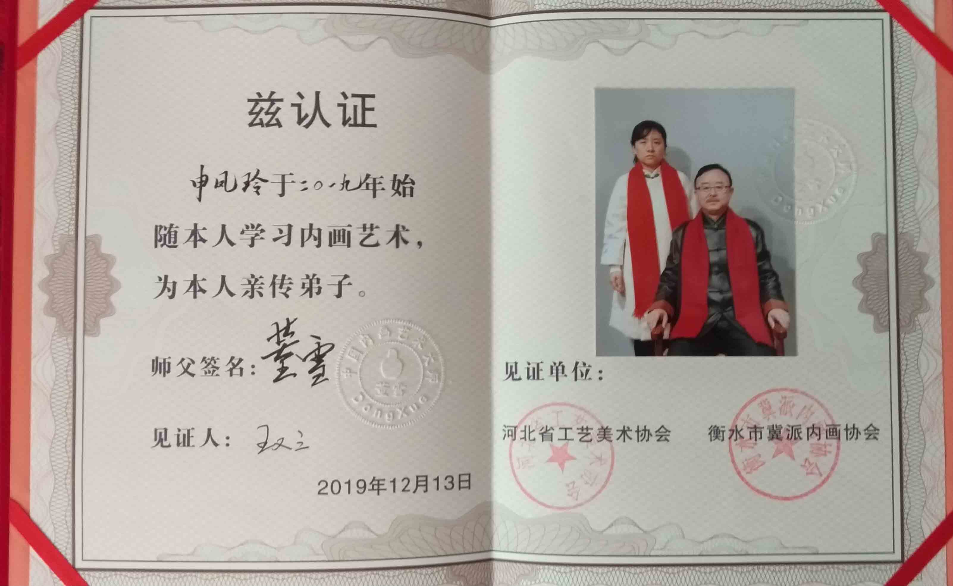 2013年为珍壶斋内画艺术研究院高技技师。其作品被众多收藏家收藏。