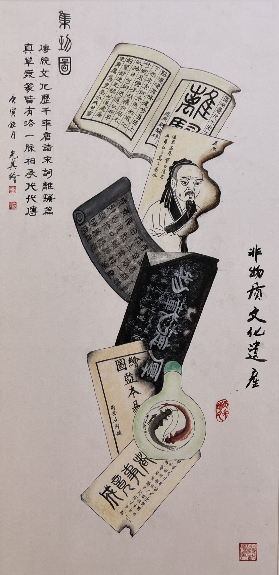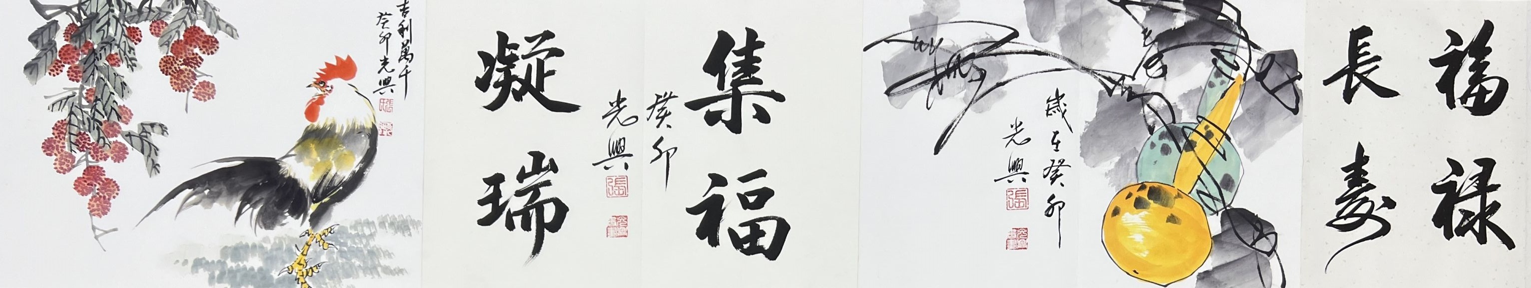 国画类:《八破图》《百虾图》《龙腾九霄》《五福临门》《和和美美》《金玉满堂》《龙腾吉祥》《神龙赐福》《脸谱》《名人书法》