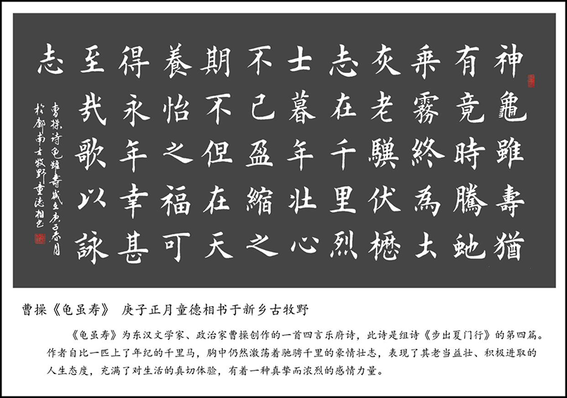 童德相,1953年生于河南牧野,毕业郑州大学中文系,书法功底深厚,其创作奔放自由,法度严谨,厚重而不失飘逸,灵动而不失庄重。专攻楷书、隶书,精研欧体楷书,书法功底深厚,达到以假换真的境界,在国内外获得金奖多次,全国书协组织的书法大赛,获得楷书金奖二次。