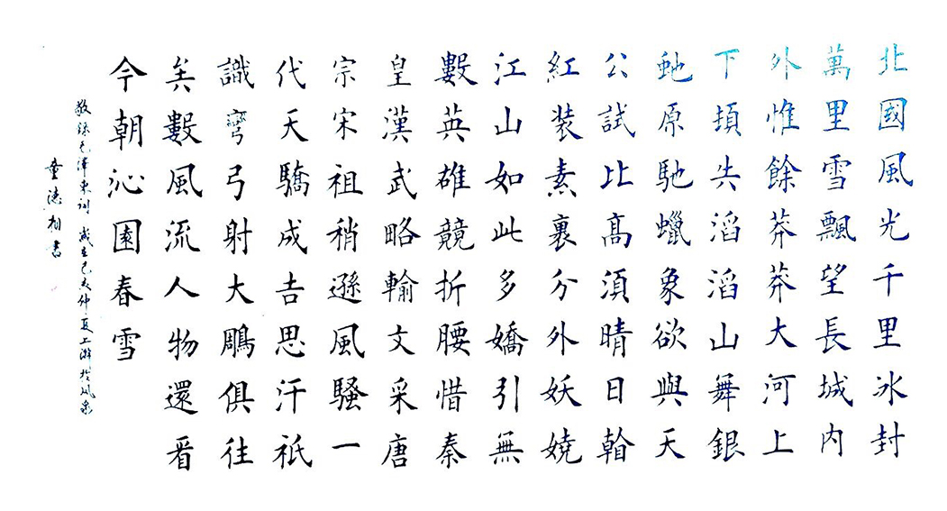 童德相楷书清秀美观,其笔法森严,传承了汉隶和晋代楷书的特点,又融合六朝碑贴,博取多家之长。点画配合,结构安排,则是平正中寓峭劲,字体大都向右扩展,但重心仍然十分稳固,无欹斜倾侧之感,而得寓险于正之趣。经过几十年的临习,形成了自己的风格,得到收藏爱好者的高度认可,特别是古典名篇作品,备受藏家青睐。