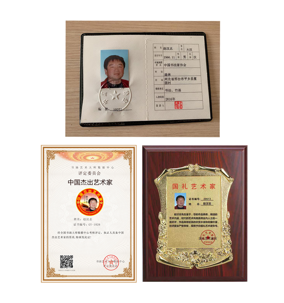 赵汉志,笔名,大汉,1966年生于河北省,邢台,自幼生长在书画世家,毕业于中国书法函授大学,现任中国书法协会会员,省书协会员,国礼艺术家和中国杰出艺术家称号,书法擅长行草见长,临帖以王羲之,柳公权,颜真卿等诸多名家字帖,在多年的砚耕中,积累了深厚的书法理论和创作经验,书风高古大气,很多作品诸见报刊杂志,其作品多次在全国大展中展出并获奖,得到广大书法爱好者的一致好评,大汉作品曾多次在全国各地,及海外举办书法艺术展,诗竹画,又名竹福画,谐音《祝福画》更是大汉的精心之作,可以把各种祝福的词汇及个人签名,用竹叶的形式拼成字,做到画中有字,字中有画,给世人一种高欣赏,高追求,高品味的时尚礼品,多幅精品已被国外收藏机构及国内友人所收藏。