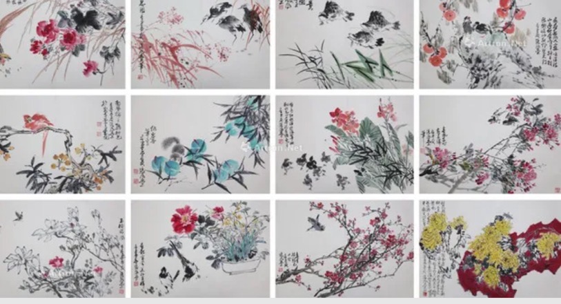 他的写意画作品,布局用笔大气磅礴。《张凤堂花鸟册页》,所画玉兰、牡丹和墨梅,其主干往往用大笔上下直扫,其枝叶则多作斜势,左右穿插交叉而成对角倾斜之势。张凤堂尤喜画紫藤、葡萄、南瓜、葫芦等题材,放笔横扫竖抹,有笔走龙蛇之势。张凤堂的大写意花鸟画构图有一一个特点,为增其气势。卧作名山游,烟云真供养。”题款不但帮助引发画中的诗意、深化画面的意境,并且作为书法,在画面起到烘托映衬、联接照应的作 用:加之留空布白、用印位置的悉心经营,其诗、书、画、印浑然融为一体, 使画面呈现出神完气足的气象。这是文人画一贯之的风格,在张凤堂作品中得到最为充分的体现。
