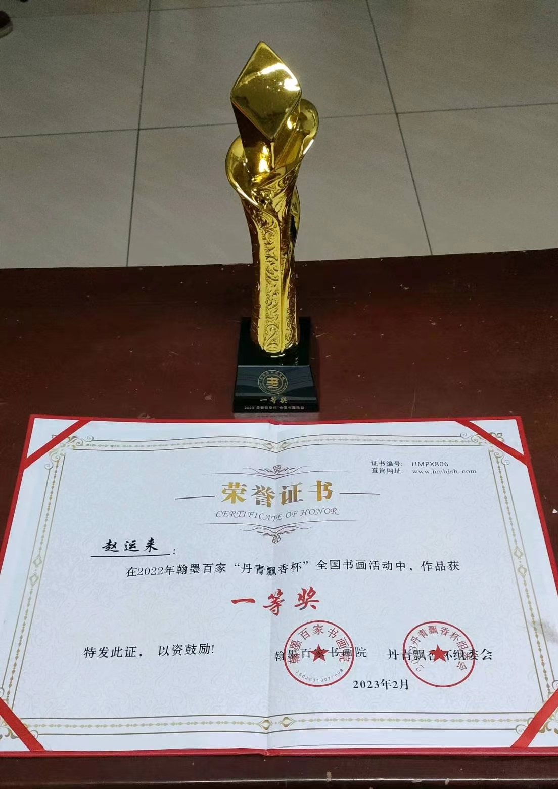 2023年2月, 在参加全国翰墨百家。丹青飘香杯 ,全国书画大赛活动中获得一等奖。