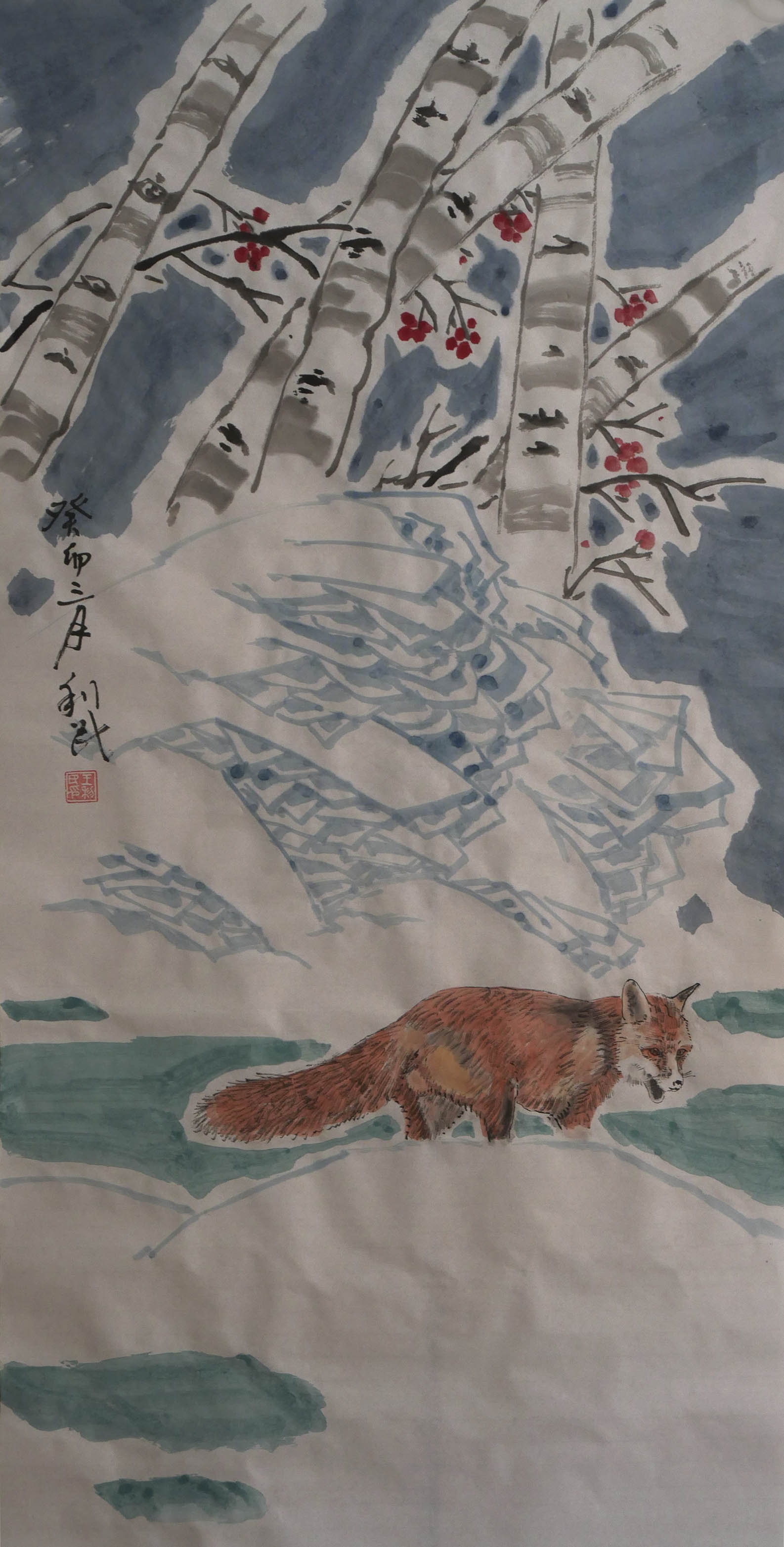 能不能在中国画中体验时间艺术的气韵特点呢?当然能,历代画家都有探索,但是很难说时间的介入已经形成了比较成熟的体系结构。时间在中国画画境里的体现,总是点状的,分散的,零星的,而是非线性的结构体系。所以著名画家王利民先生的塞北雪景花鸟画专题创作,对于中国画时间韵味的酝酿来说,完全改变了以往中国画忽略时间的审美缺憾,为中国画创作注入时间气韵进行了系统性的构建,形成了绘意雪韵,情调独特的气象特征。雪景花鸟,让他成为最好的冬雪风韵的表现者,也成为把时间气韵融入东方审美体系最完整的建造者!