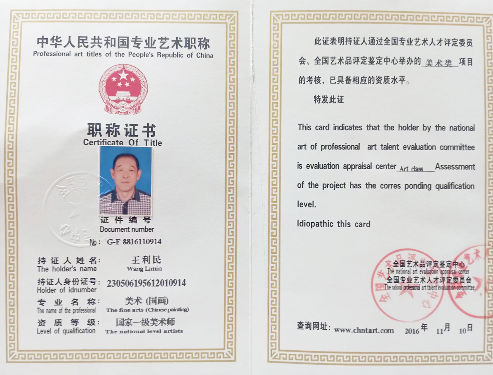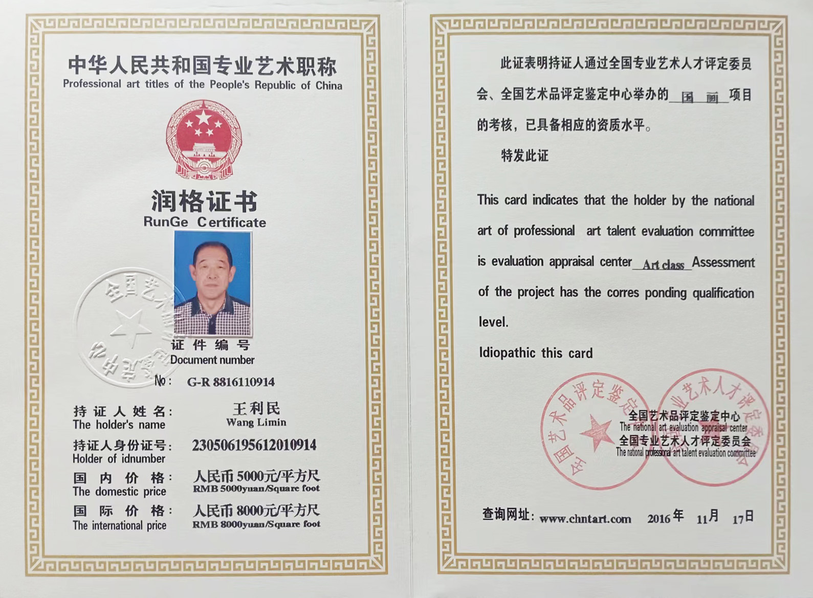 2016年11月,经全国艺术品评定鉴定中心评定国画作品国内价格:RMB5000元/平尺,国际价格:RMB8000元/平尺