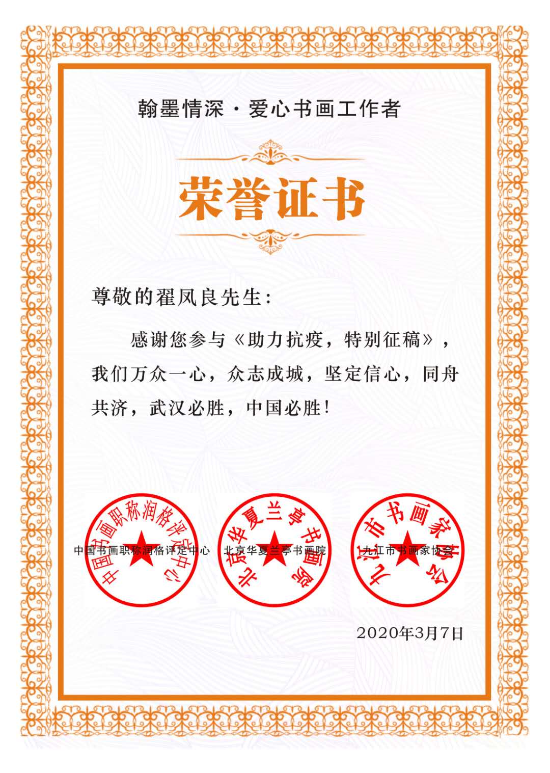 加入北京华夏兰亭书画院院士,被中国书画评定中心评为国家一级书法师。