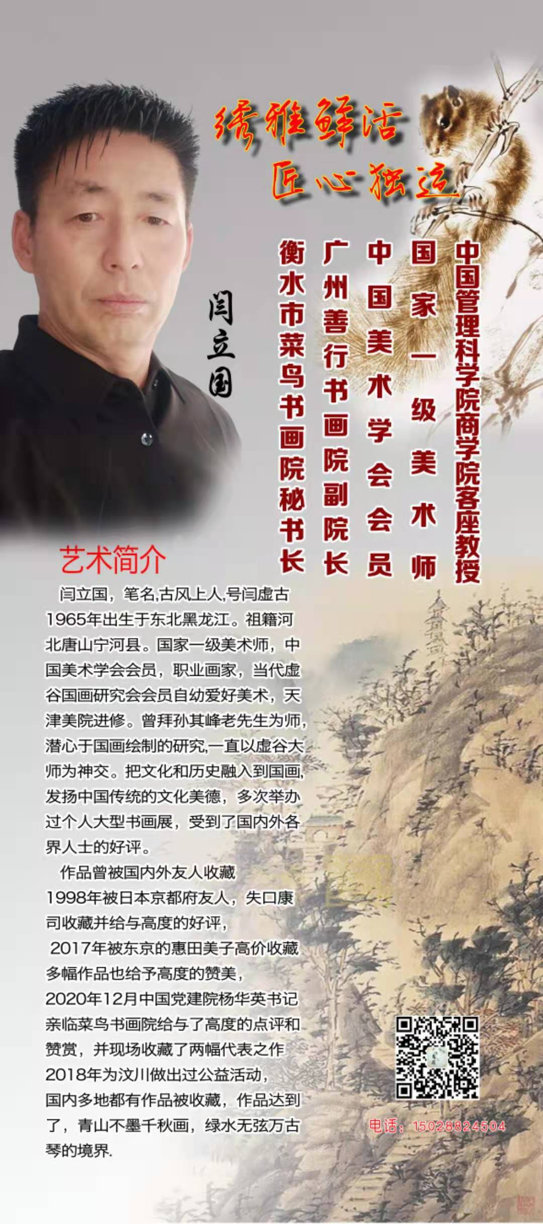闫立国,中国管理科学院商学院客座教授。国家一级美术师,中国美术学会会员,职业画家,现为广州善行书画院副院长,原北京鸿涛书画院理事