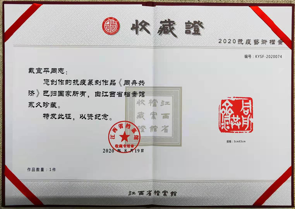 2020年8月抗疫篆刻作品《同舟共济》由江西省档案馆永久收藏;