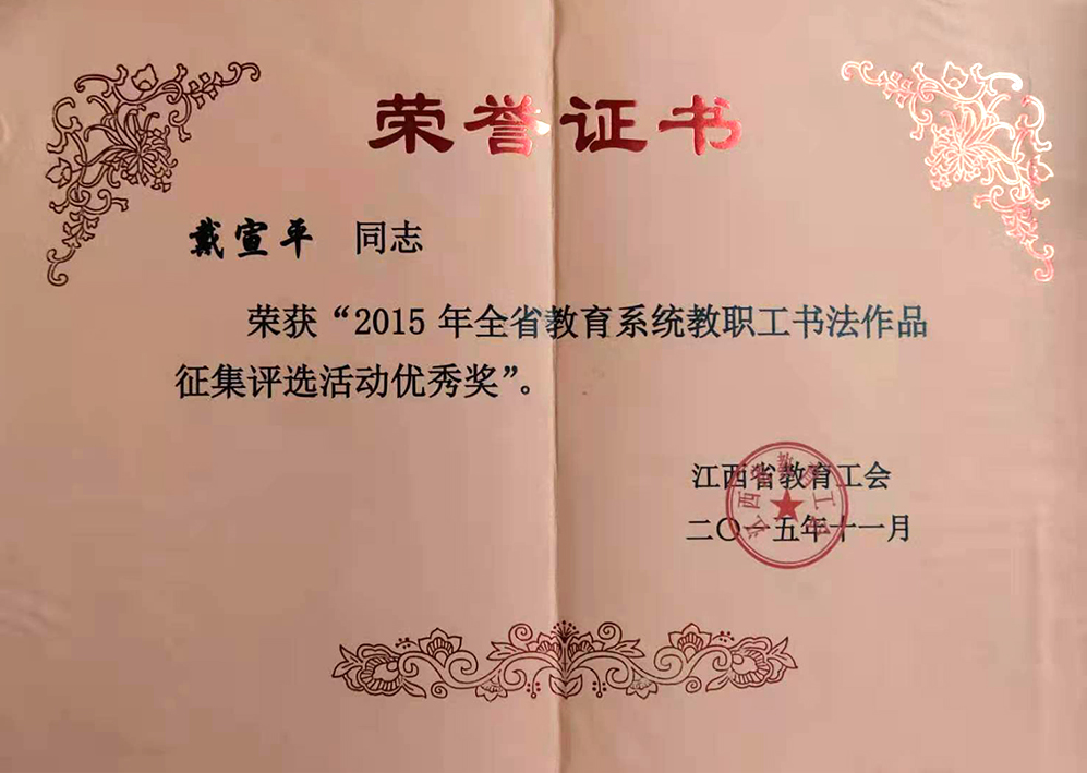 2015年11月获全省教育系统书法作品征集评选活动优秀奖;