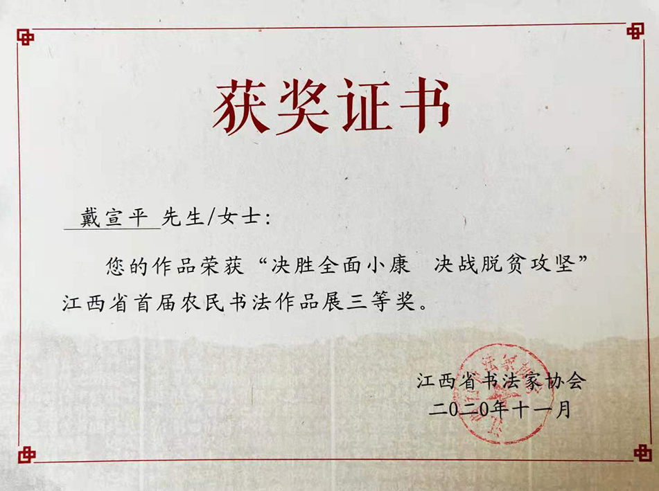 2020年11月获“决胜全面小康 决战脱贫攻坚”江西省首届农民书法作品展三等奖;