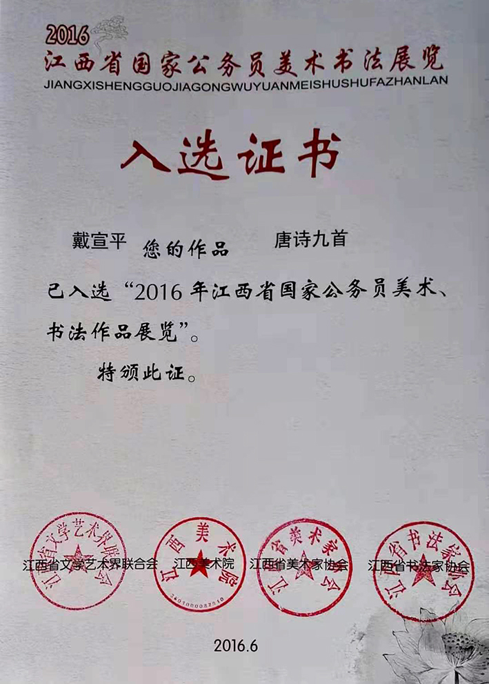 2016年10月获江西省九江市教职工书法比赛三等奖;