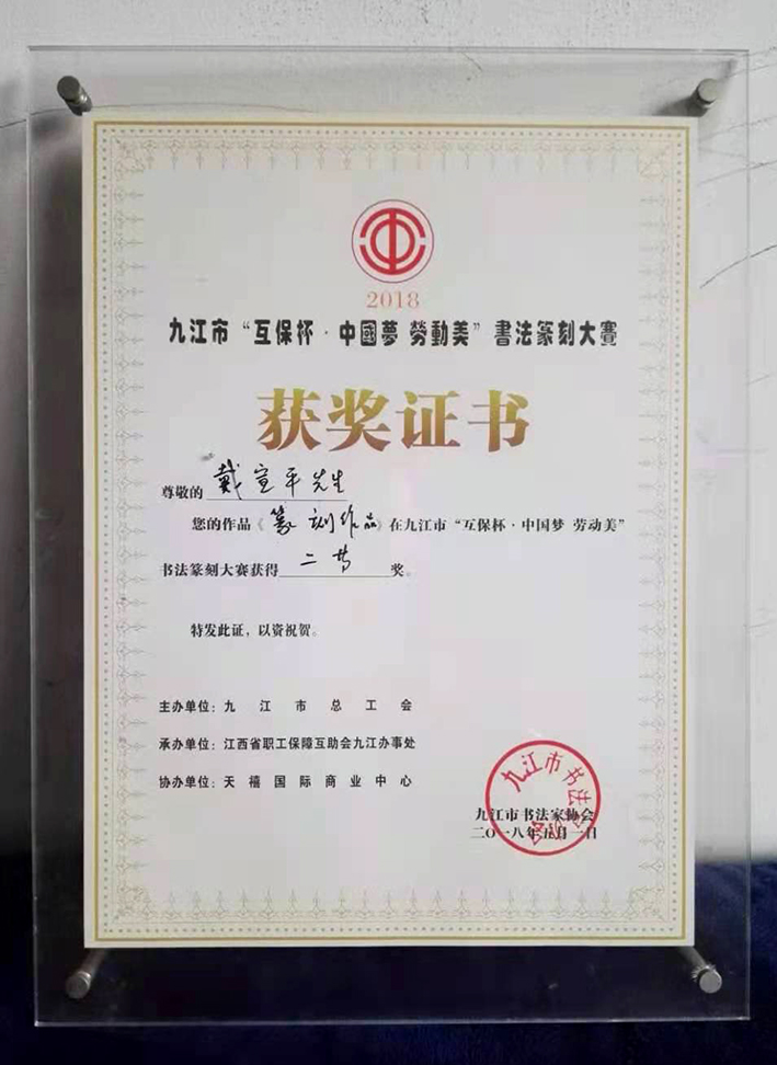 2018年5月获九江市庆五一“互保杯•中国梦 劳动美”书法篆刻赛二等奖;
