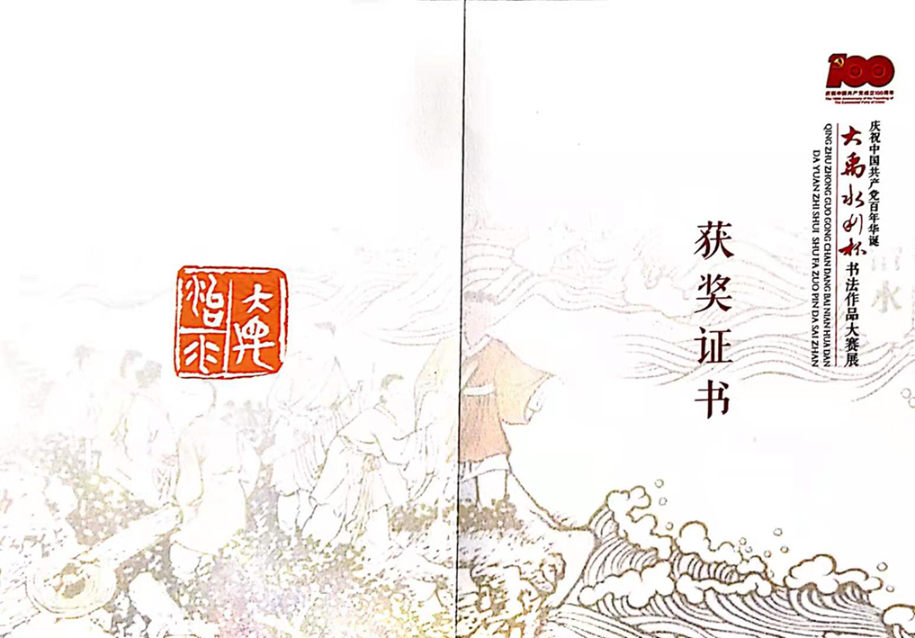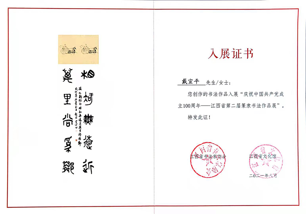 2021年8月获庆祝中国共产党成立一百周年“大禹水利杯”九江市书法作品大赛一等奖;