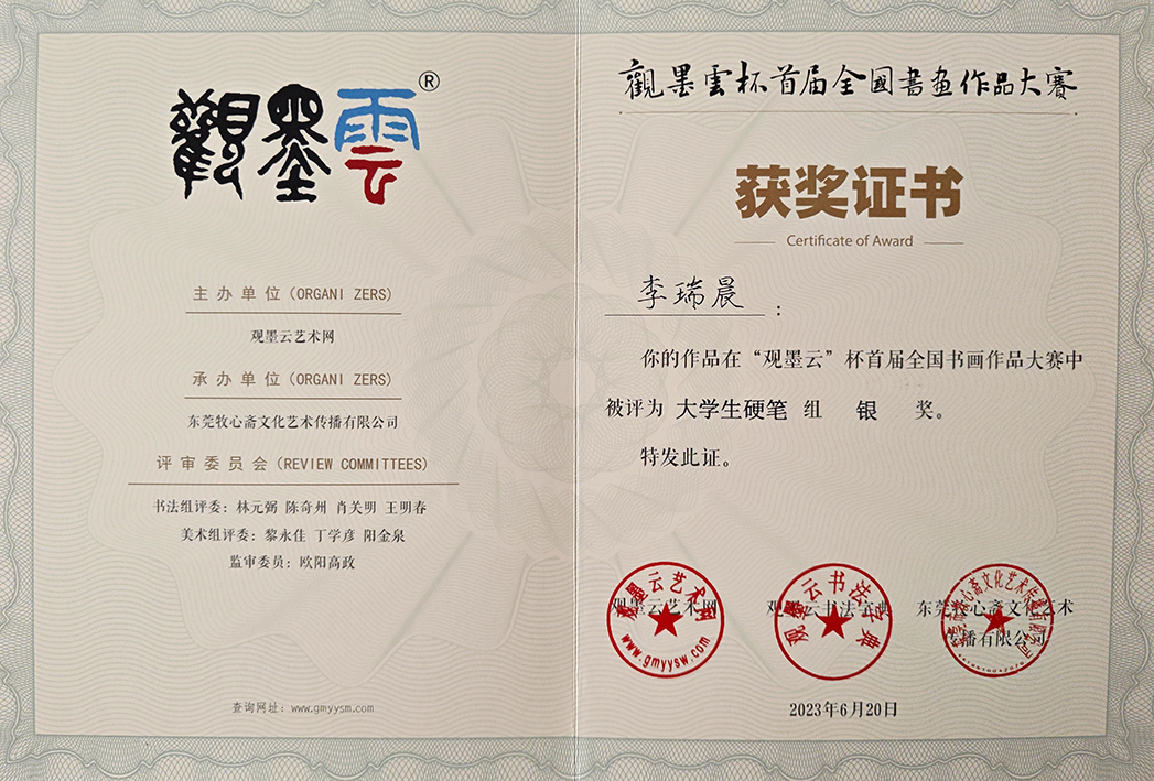 2023年6月作品在“ 观墨云”杯首届全国书画作品大赛中被评为大学生美术组铜奖。