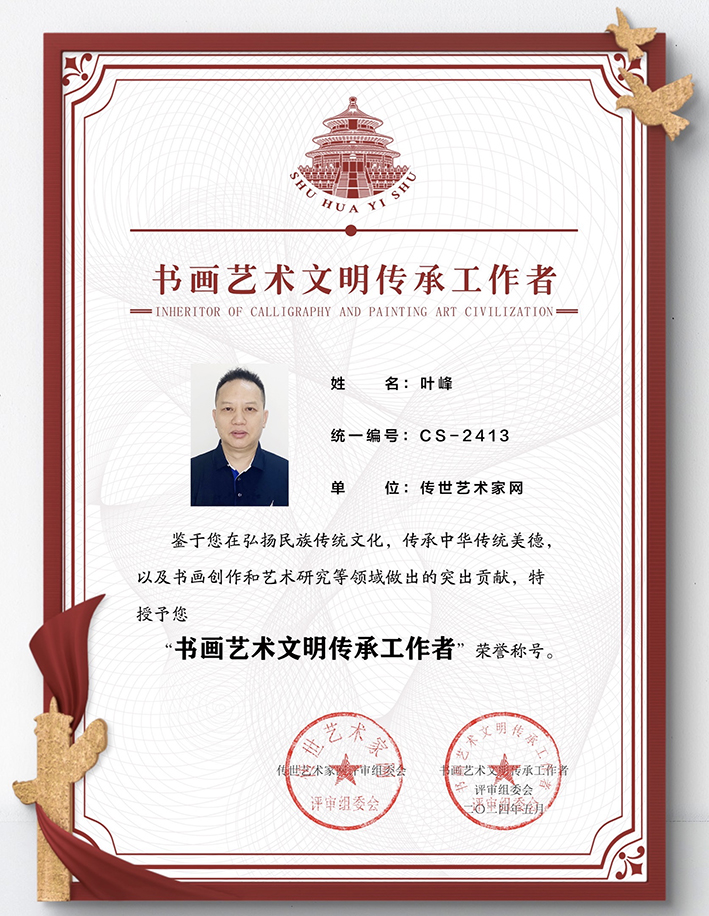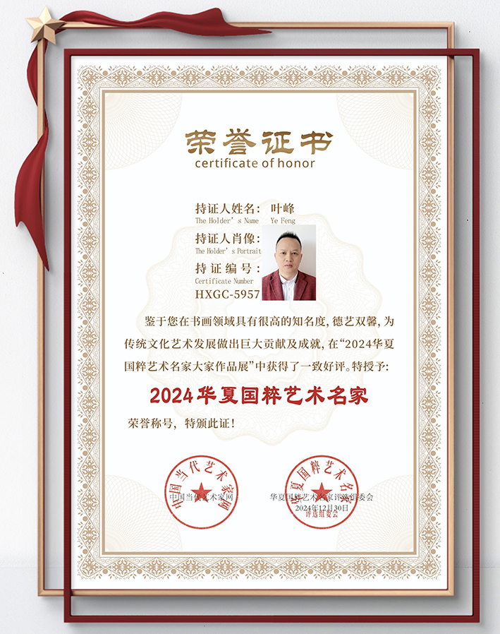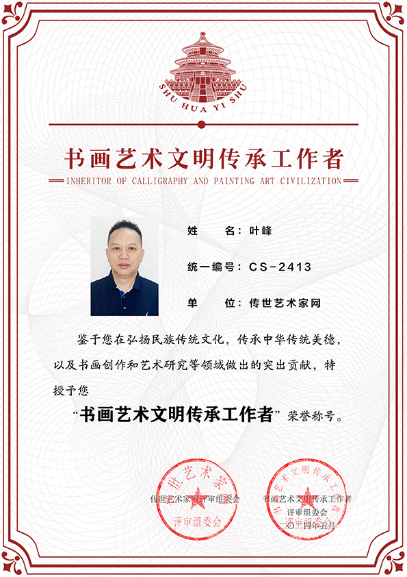 叶峰,男,汉族,生于江西省九江市,中国江西籍书画家,书法斋名:墨轩斋,毕业于江西师范大学美术学院,土木工程室内装饰设计,任江西美术家协会会员,任深圳市龙华区书法协会会员,九江都昌书法协会会员。出生于书香世家,自幼家教严格,在父母的引导和教育之下,叶峰在心中萌发出对书画的热爱。个人曾多次举办个人书法展,参加慈善活动、募捐100多幅书画作品。