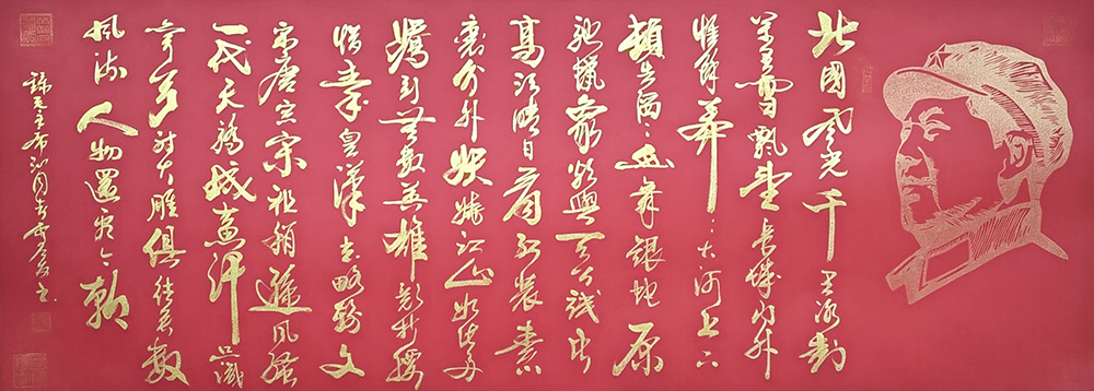 作品《沁园春·雪》被人民大会堂永久悬挂,章法布局独具一格,字体大小错落,浓淡干湿枯相得益彰