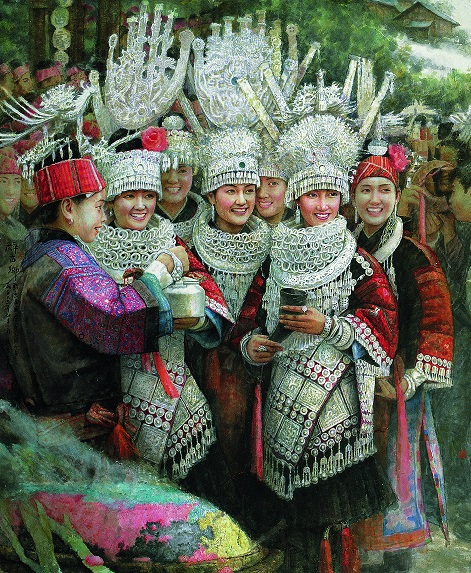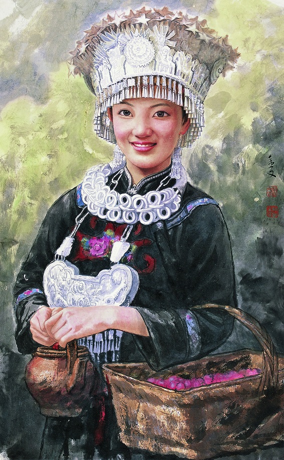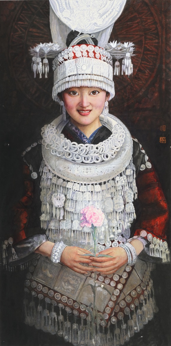 在作品中坚守少数民族当下的本真,力求画面墨彩交融的唯美。作品重写实,讲笔墨,严造型,全色彩,形成了特有的现代彩墨写实中国人物画风格。