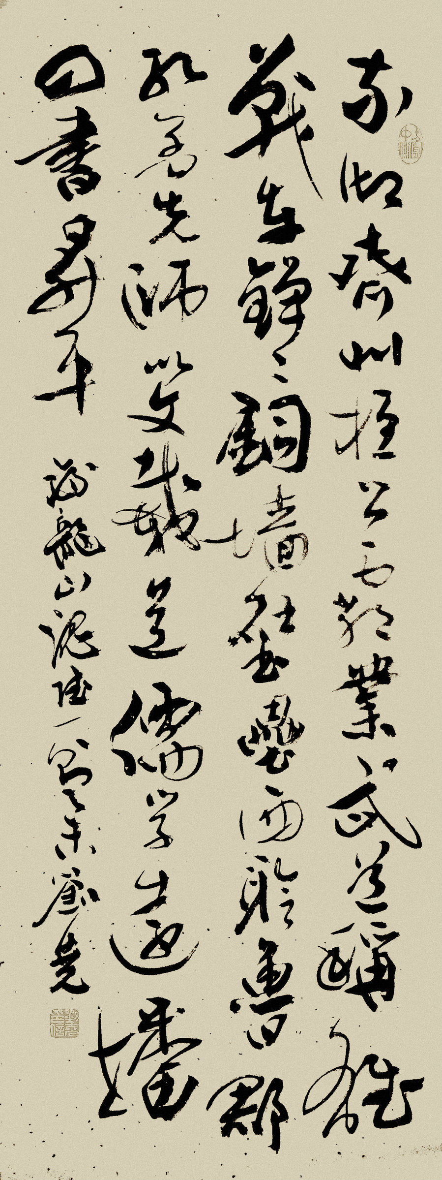以师宗“六朝”之笔,而标新领异,融古创新。“方、圆、中、侧”四大笔法相交融合,“笔法之妙贵在通达方圆中侧之理”,书法学术意象千姿纵横,方圆侧锋交融放浪;鹰踞凤阁刚寓柔,虎跃苍穹挽大风,六朝辞法黯然,楚汉赋象无形造。《跋》云:“齐鲁泉城,刘尧儒仕,号寒泉阁主人。夫簇以书之采,启丹青之稽铄。书法意象,擅隶行兼草篆,尽得“奇峻险雅”之味于墨上,“方圆中侧”之法而交融,宗法乎师大象,乃造无形之化工哉!”。