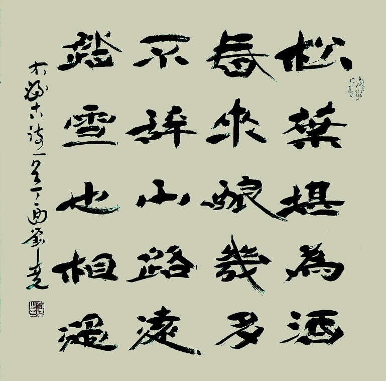蹉跎岁月,暑至寒往,幼识翰道,携笔从戎,慕名师于京畿,朔寒泉为甘露,搏翰技于艺苑沙场,得悟寸短尺长,遂立寒泉之书纲。历京晋苏鲁,濡墨染身,仰故园而思归,洗却墨子尘埃。而立初年,居七二名泉之怀抱,咫尺相距,常记寒亭日暮。半生获益,禅定“方圆中侧”四法,遂立斋名曰寒泉阁。斗室堂壁,一纸赋然:泰岱黄河越千年,词宗清照史龙山。雄秀朴逸润翰色,诗书百脉出寒泉;清照园里百脉涓涌易安词,城子崖上寒泉滴萃龙山魂;五岳诸峰尊泰巅,群河潺潺朔黄源,造化千秋神州秀,齐鲁儿女尽增颜。幸甚至哉,寒泉铭至,歌以咏怀,有感于斯文。