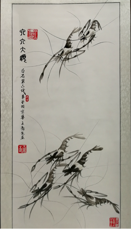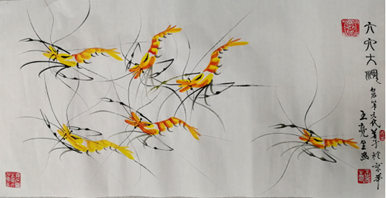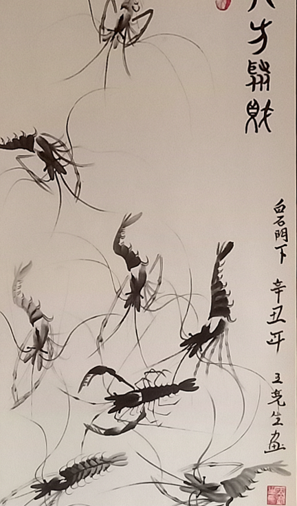 观王亮生先生的画虾趣图,用笔或轻或重,用色或淡或重,深入浅出,大小有序,动静结合。其笔下的虾极富趣味性和生命力,其完美的形状、跳跃的姿势以及充满灵性的构思,都使艺术造型的形、质、动三个要素臻于完美。不仅完成了齐白石老人创作过程臻达形神、栩栩如生的准则,更在此基础上加工提炼,精进不休,使画作真美合浑然天成,不仅形似更是神似,着实提现了今日齐派画艺的成熟。