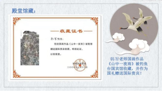 韩军,能工善写,当今画坛极具增值潜力的学院派山水名家。1973年生,山西河津人,现居北京,中国美术家协会会员,中国艺术研究院研究生导师,中国工笔画学会会员,作品入围入选中国美协主办的全国展览二十余次,2019年作品《飞天梦圆》入选第八届国际双年展,并在中国美术馆展出,随后在全球二十多个国家巡展,获此殊荣的国画家全国仅8位。