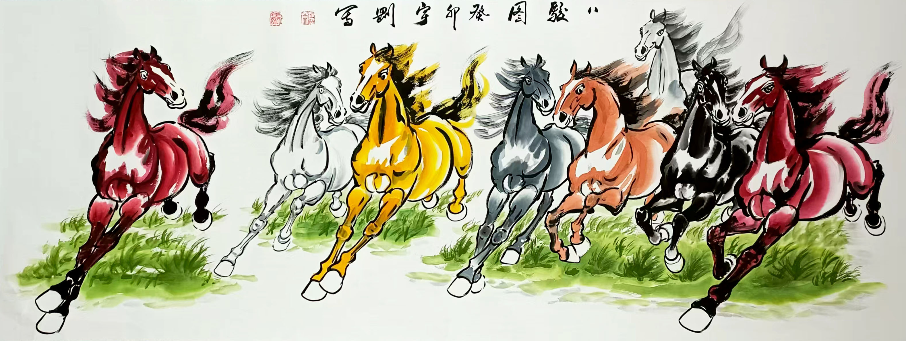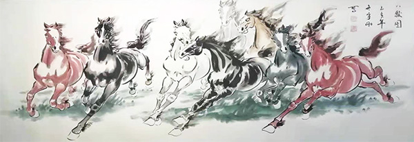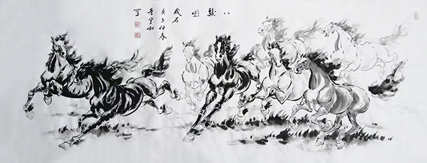 骏马历来是文人墨客歌颂的主题,在中国画坛上,马的形象、精神和神韵,占有突出的地位。景先生属龙,自诩常有龙马精神,而其又爱画马,画出的马尤其突出马的龙性。先生在二十多年的绘画研习生涯中,靠着自己的艰辛磨练,和对艺术的不懈追求,与画马结下不解之缘,并在中国国画界终有所成。先生笔下的马,神形兼备,写意马以草书入笔,勾勒顿挫间,无不透露出其深厚的笔墨功底。他的画马作品,有龙的精神,马的神韵,结构严谨,神形兼备 ,笔墨到位,夸张之处又不失法度,是当今画马界不可多得的奇才。”他的三分钟画马方法用简单到位却苍劲有力的笔墨勾勒出或卧或立、或动或静的马,让人拍手叫绝。