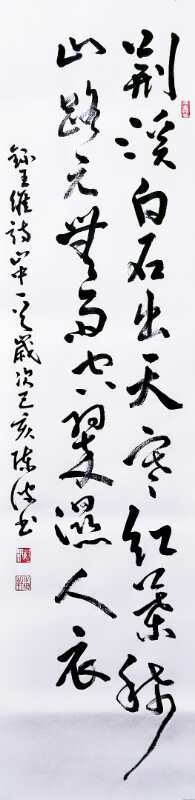 观赏她的书法,无一例外每一幅作品都带有文人书法的书卷气,不激不厉,伸缩得体,刚柔相济,儒雅动心。一幅远上寒山石径斜,白云生处有人家,把书法的艺术美,姿态美,内容美合成的唯美醉赏,毫无疵弊,妙在使转,笔墨性灵。所以她的行草书法就是三希堂法帖的气韵复成,信札应手,书由心成!这娴熟自如的笔法,也是师造化的成果,是实践天下无物非草书的经典。