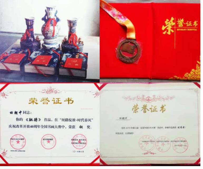 田朝中,自幼酷爱美术,五岁起由母亲沈承珩(画家)启蒙亲授,又因受舅舅沈逸千(著名爱国主义画家)影响,尤喜画马,兼攻诗词和书法。