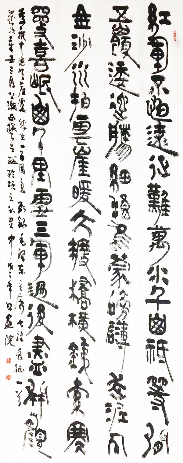 作品数十次入选国家级各类大展,且频频获奖。仍勤学钻研不止,书法各体皆能,尤擅篆隶,并以生涩遒劲、古拙老辣、富有金石味而著称,享誉国内外。