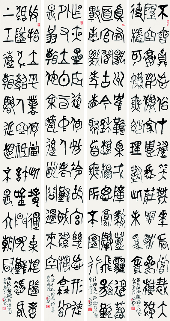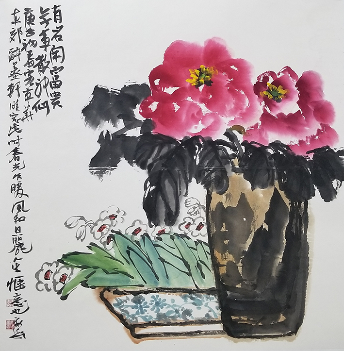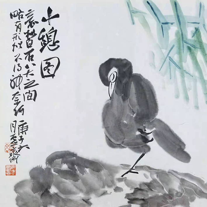 吴昌硕与齐白石,潘天寿与李苦禅,中国近代百年大写意花鸟画的四座高峰。缶翁以金石篆意入画,笔墨饱满,厚重苍古,从任伯年、赵之谦而能老辣纵横,成海派巨擘,门徒众多影响深远。白石老人漂泊北平,摒弃个山冷逸一路,取石涛、扬州八怪,仰慕缶翁尤甚,得师曾开悟而研习吴氏画风,师法其心,青出于蓝,能开宗立派,尔后执北方花鸟画坛大旗。二者虽年龄悬殊,南北相隔,于艺皆互不相让,个中关系复杂也传为笑谈。缶翁画气,白石作品极富生活情趣,而颐者潘天寿则穷于经营布局,笔墨考究,一味霸悍,前无古人。潘学缶翁最相似,而又离缶翁甚远,以气势取胜,更传指画衣钵而别开生面。李英苦禅是白石老人的第一高徒,拉洋车出身,从徐悲鸿学西画技法,素描透视对其创作在造型方面大有裨益,其鸟雀雄鹰形象准确生动,能出师门成自家风格,与潘天寿三十年代曾为同事,能共同切磋互相进步。数百年来大写意花鸟画发展到此巅峰,四足鼎力,后来多落其窠臼,鲜见有气魄开拓者,当代大写意一脉能理论结合实践、借古开今、薪火相传之佼佼者,悦石翁也。(安涛 砚田琐记之五)