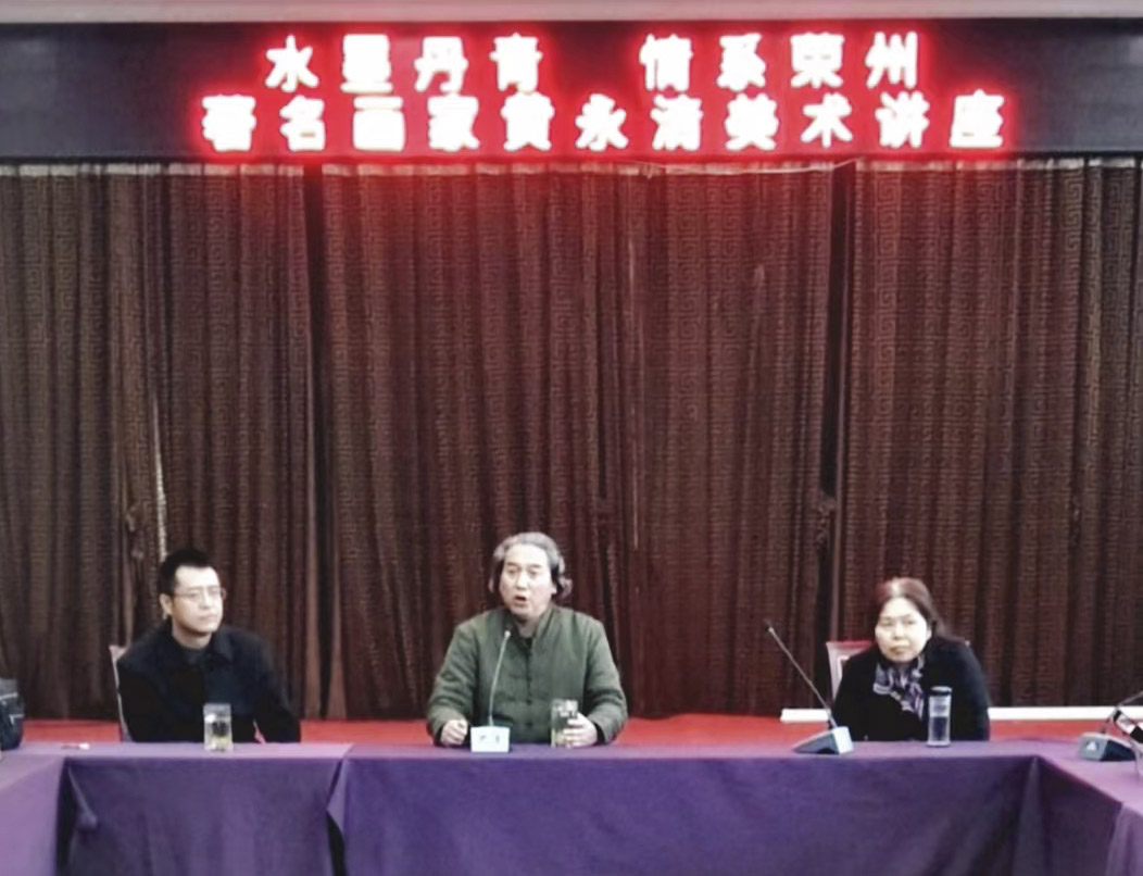2019年,远青受邀回乡举办“水墨丹青·情系荣州”美术讲座留影(荣县县委宣传部部长佘建平,县政协主席邹崇霞出席参加)