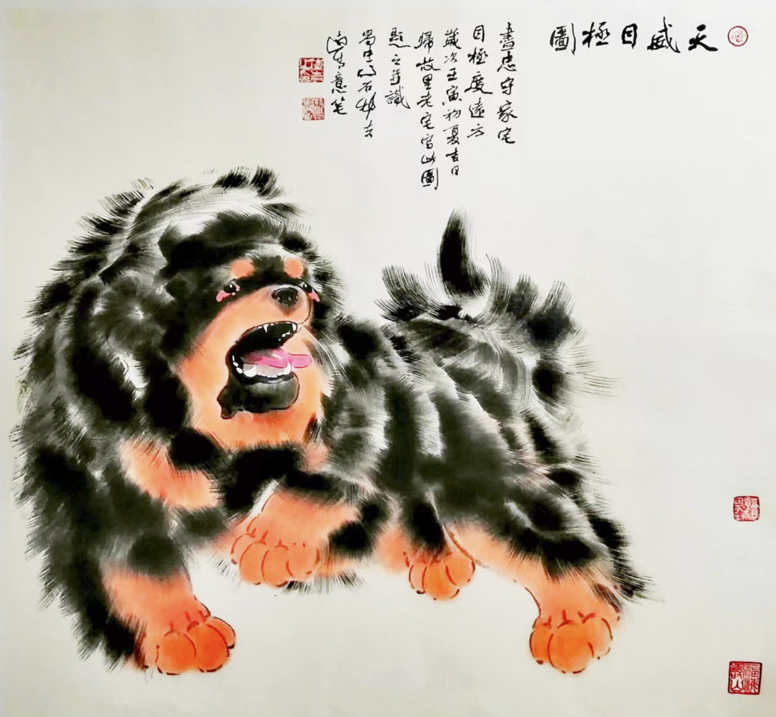 这绝不是仅仅有了造型的高妙和深厚的水墨功力就能表现出来的境界,这是画家胸襟的外化和具化,这内在的情怀决定了艺术作品的格调。所以优秀的艺术都是艺术家人格的凸显和展示,远青能常年跋涉在青藏高原,披着寒冷与酷热,视藏獒为兄弟,这不仅仅是为了画好藏獒,更是他内心的品格在攀升,是他的凌云之志在召唤和照耀,是一种不可阻挡的英雄气势在迅猛地扫荡大地。