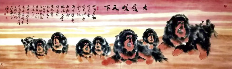所以,远青画这些藏獒的核心是爱,因为爱发现了藏獒的美,因为爱有把思想渗进了美;爱使思想坚定,思想使爱有了价值。爱是流动的美,美术是凝固的爱。正是这种爱使远青对藏獒的情感变得细腻和多情,使这些平凡的动物充满了生机和光泽,而思想又让这些光泽有了内容有了充实!远青就是通过这些动物诉说着自己的心灵和对生活的理解和热爱,用线条擦去蒙在生活表面上的灰尘和污垢,让生活重新放出美好明洁的光芒。他把艺术直接引进生活了,这使艺术走下了神坛,变得亲切和普通;同时他又把生活艺术化了,使平凡的生活变得美了、神圣了。这种思想动机又让远青的创作越过了动物的、个人的喜怒哀乐,升华到思想的哲学的领域。